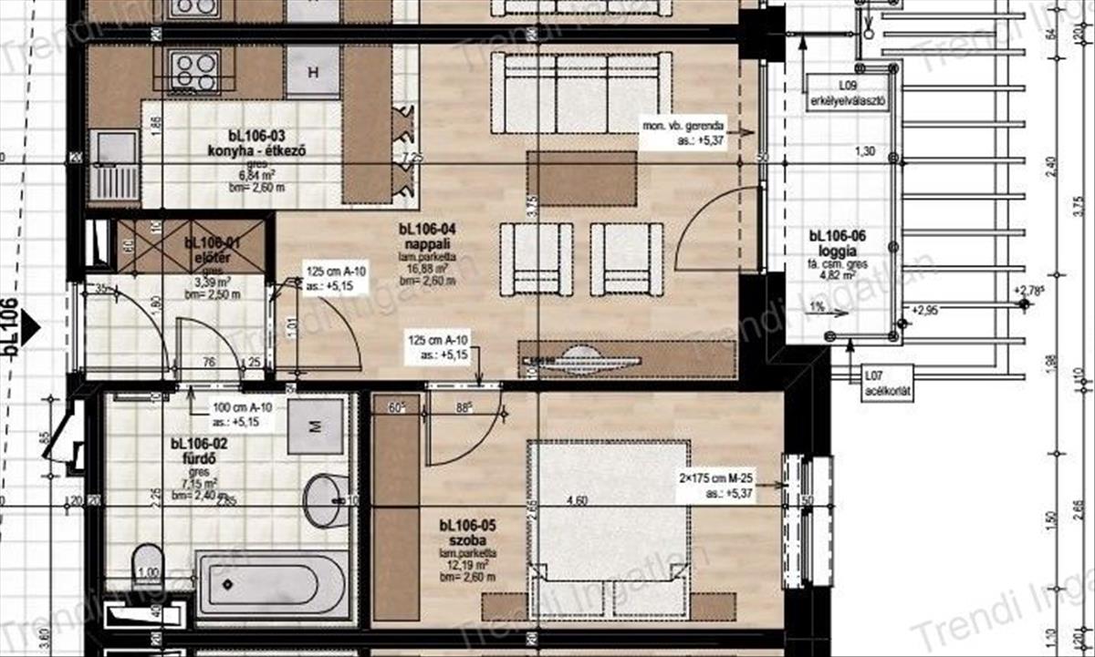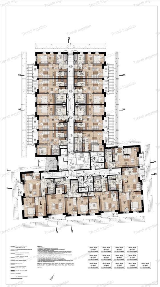 A meghirdetett 1. emeleten található 46, 45 nm -es lakásban amerikai konyhás nappali, szoba, fürdőszoba, előtér található. a nappaliból 4, 82 nm -es loggia nyílik.