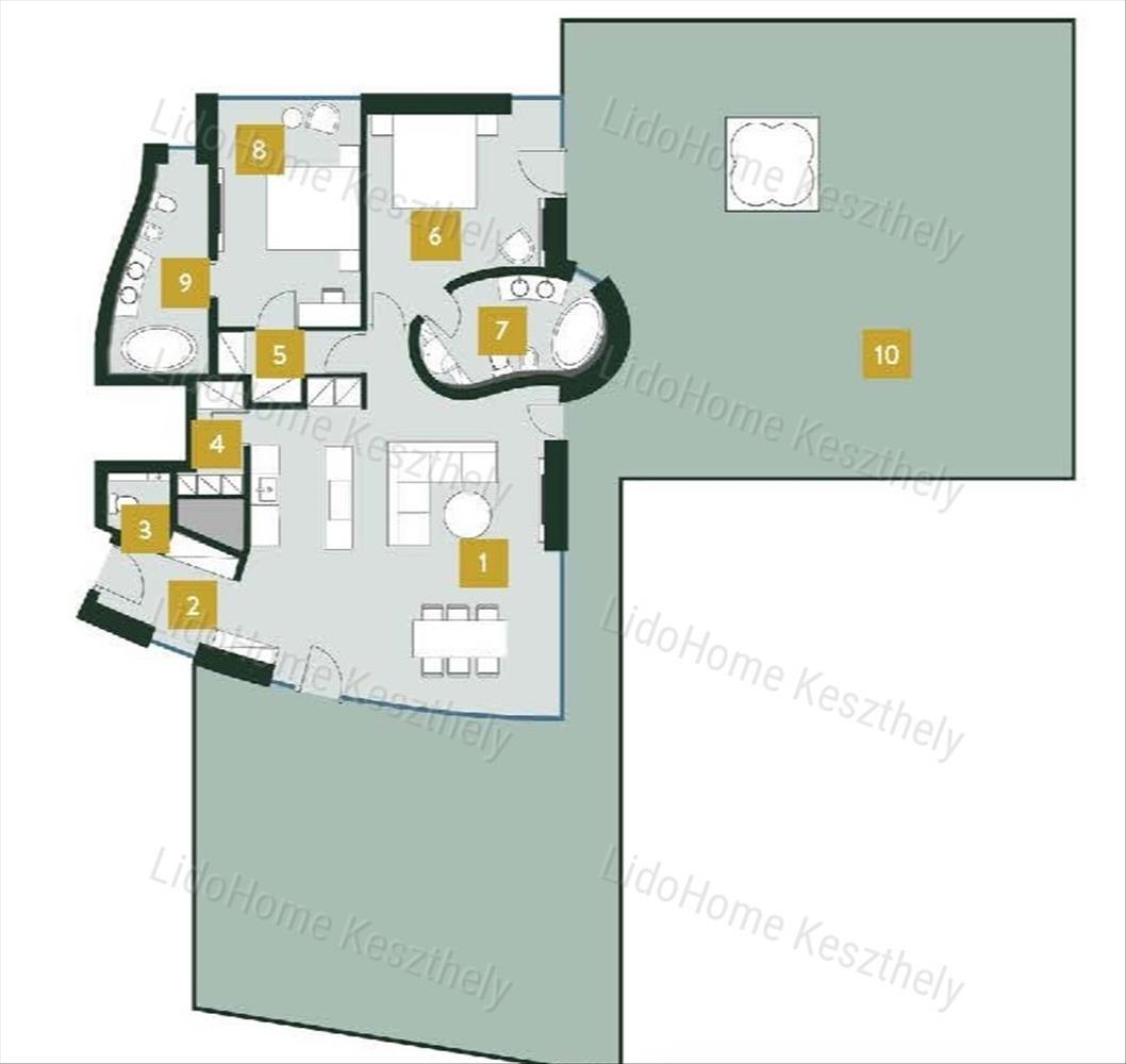 - a lakások 48-130 m2-esek, melyekből 102-251 m2 területű tágas teraszokra léphetünk ki. a közel 3 méteres belmagassággal kialakított lakások nagy ablakai a tavakra, dombokra és a golfpályára nyújtanak csodálatos kilátást.