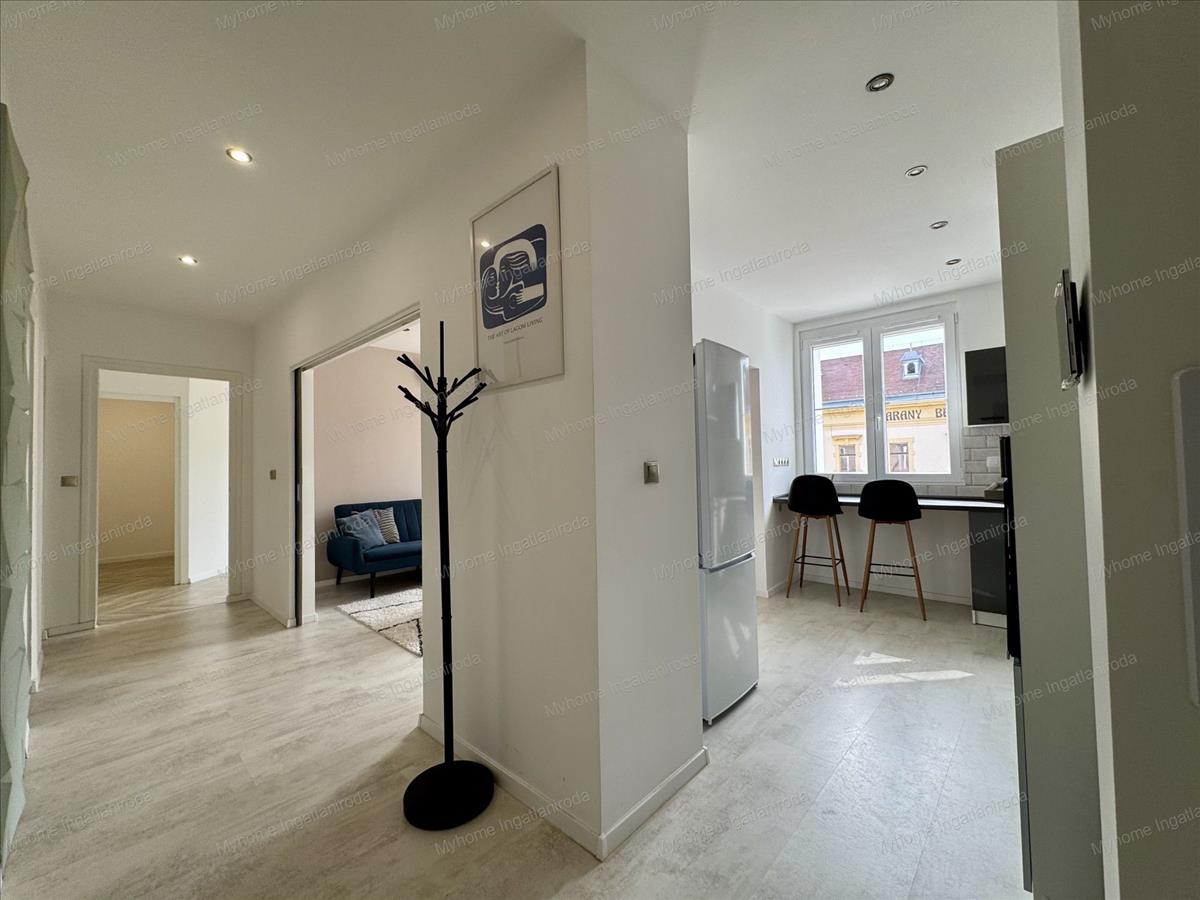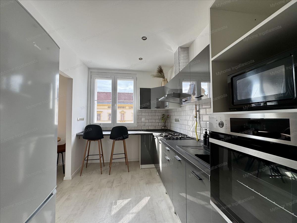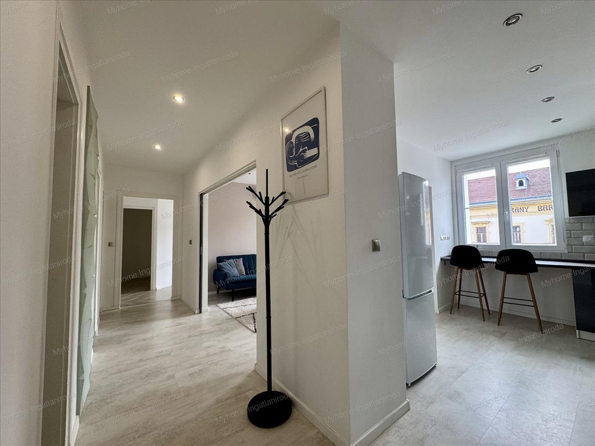 Eladó Zalaegerszeg belvárosában, a Széchenyi téren egy teljeskörűen felújított, 55 m²-es, 3. emeleti, prémium okos otthon, amely azonnal költözhető állapotban várja új tulajdonosát.