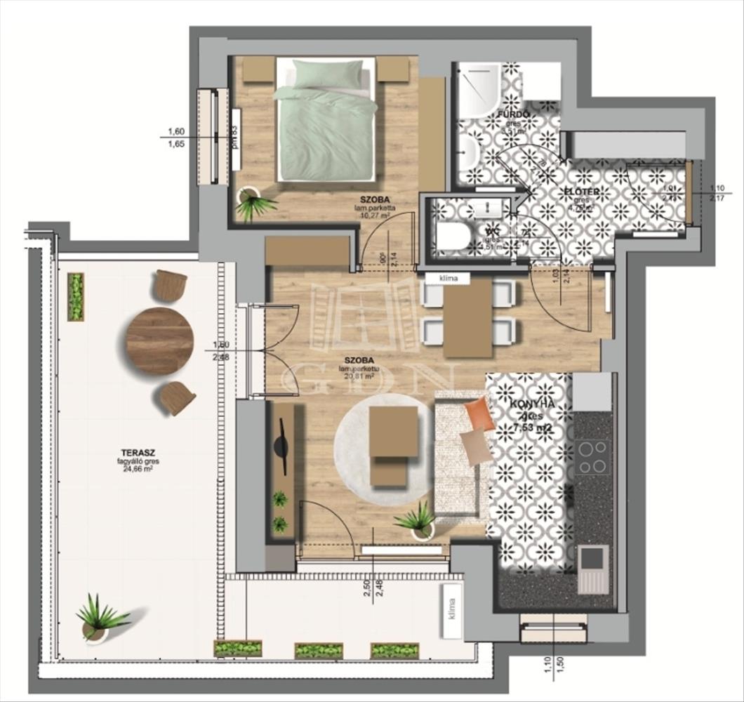 Hűtési rendszer: a lakásokban alap állapotban hűtés nem lesz, de split klíma rendszer elektromos és gépész előkészítésével az utólagos telepítés lehetősége biztosított.