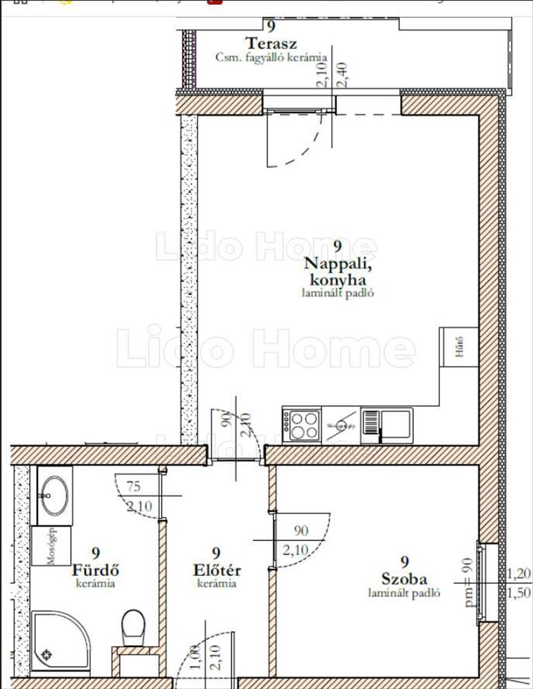 -Lakás 43 m2 + erkély 5 m2 a felével számolva összesen: 46 m2, nappali 1 hálószoba