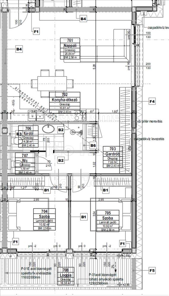 -Helyiségei: amerikai konyhás nappali, étkező, 2 hálószoba, gardrób, fürdőszoba WC-vel és egy külön wc, valamint egy 10, 3 m2-es, fedett terasz (loggia)