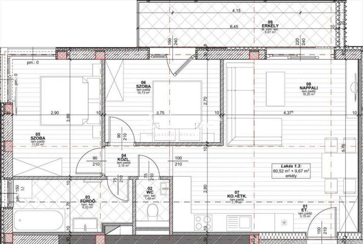 A lakás kialakítása: amerikai konyha étkezővel és nappalival, 2 hálószoba, fürdőszoba wc-vel, valamint kertkapcsolat.