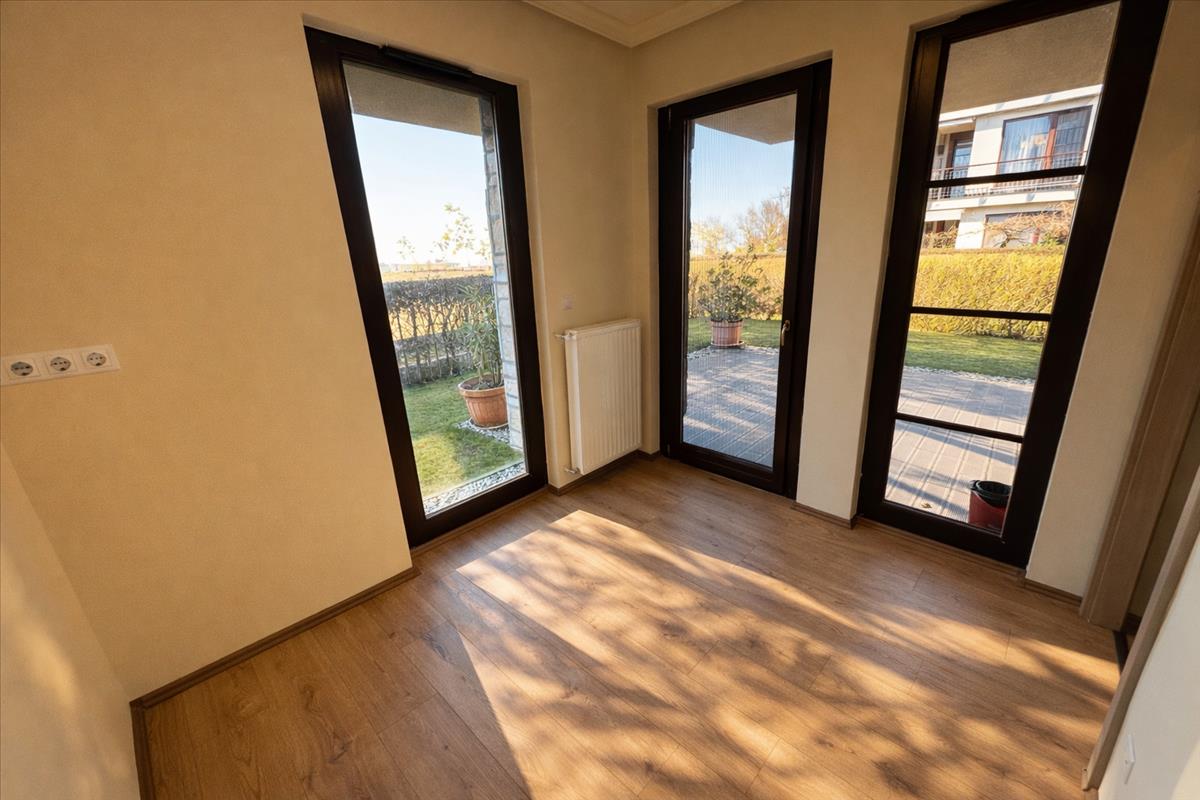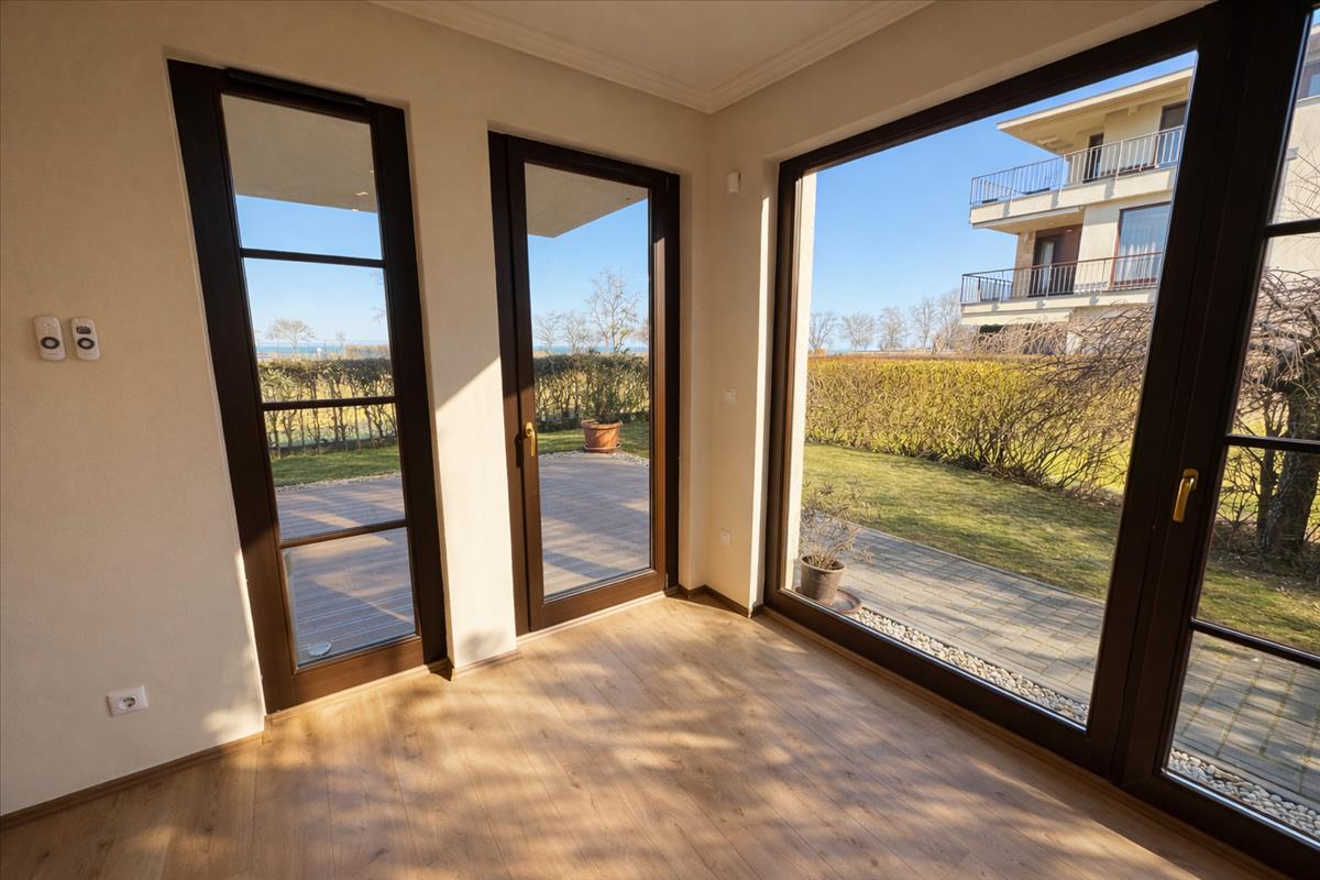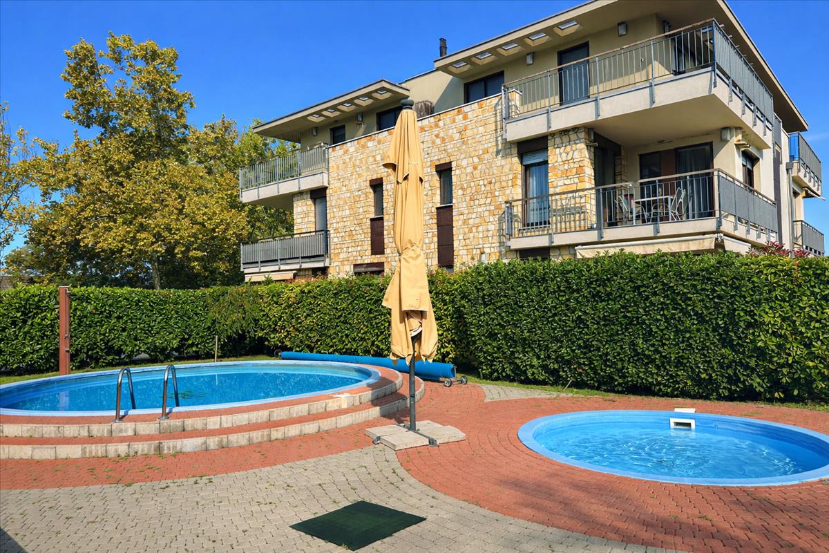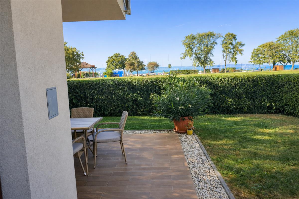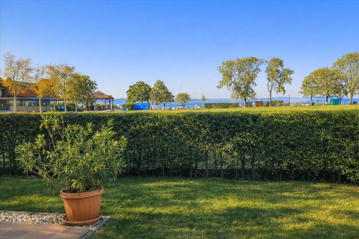 Eladó zárt, őrzött lakóparkban egy vízre néző, földszinti lakás, melyhez 16 m²-es terasz és 80 m²-es saját kertkapcsolat tartozik.