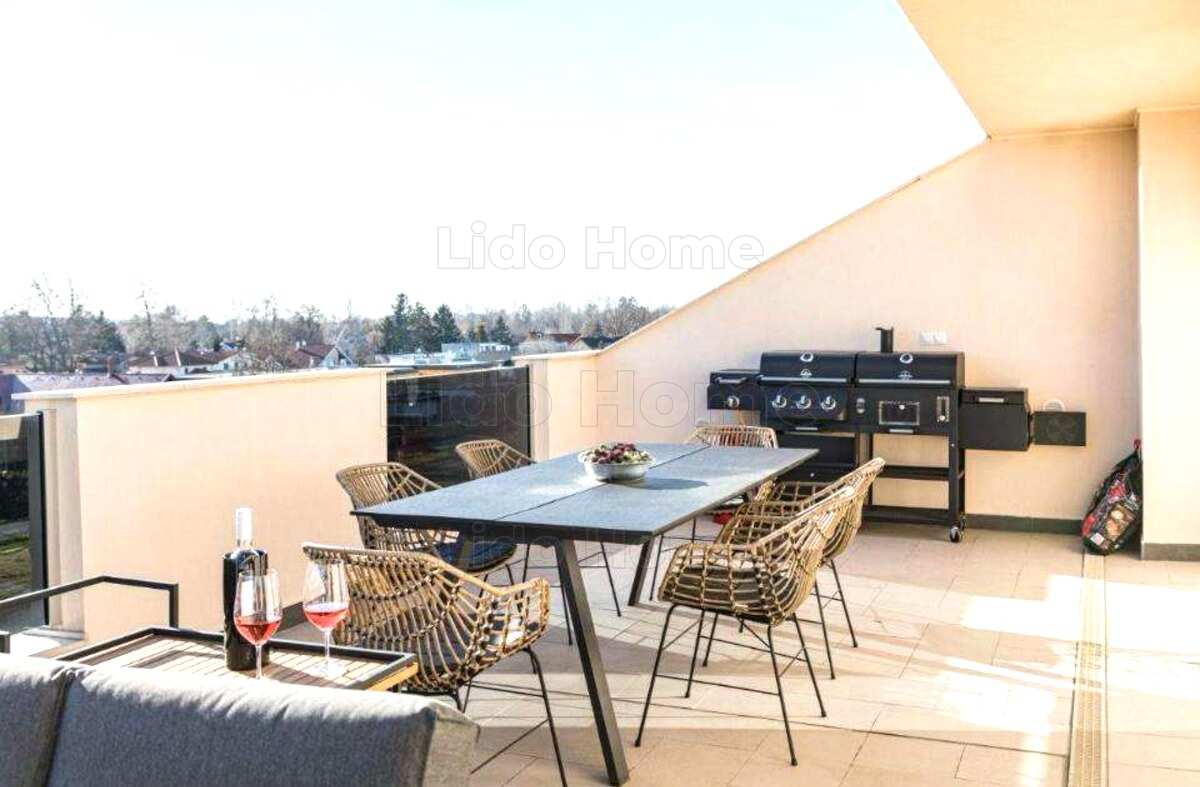 -Lakás 61 m2 + tetőterasz 63 m2 a egyharmadával számolva összesen: 82 m2, nappali + 2 hálószoba