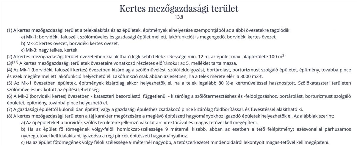 (6) a Mk-2 (borvidéki kertes) övezetben - kataszteri besorolástól függetlenül - kizárólag a szőlőtermesztéshez és -feldolgozáshoz, bortárolást, borturizmust szolgáló épületet, építmény, továbbá pince helyezhető el.