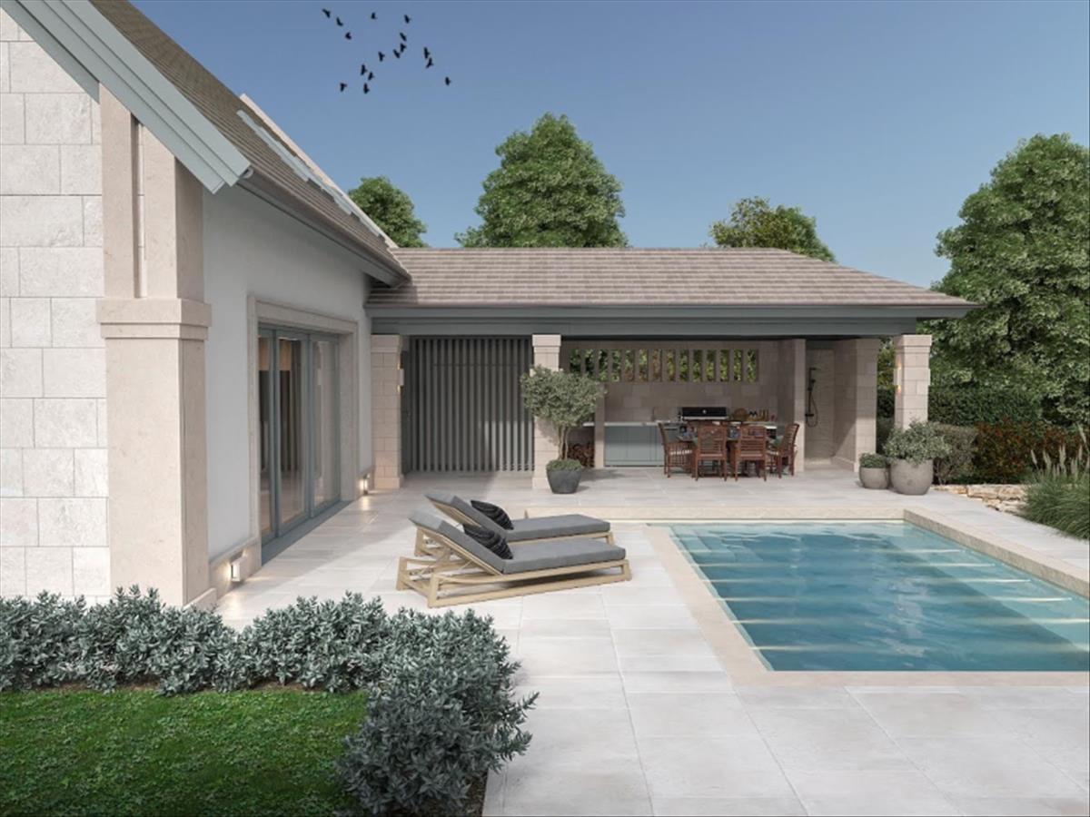 Extrak: saját kert, privát medence (6x3 m), 60 m²-es terasz, 30–65 m²-es nyári konyha/kültéri nappali, fedett kocsibeálló