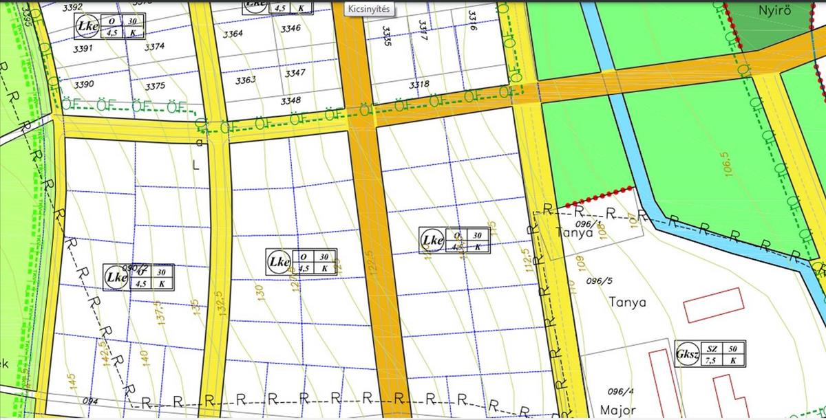 Az ingatlan 30%-ban beépíthető. Belterületi lakó övezet. Oldalhatáron álló épülettel. Megengedett építménymagasság 4, 5 méter. (Csatornamagasság). LKE-O-30-4, 5-K