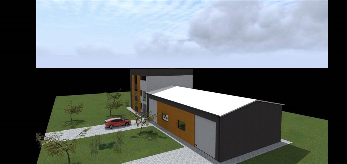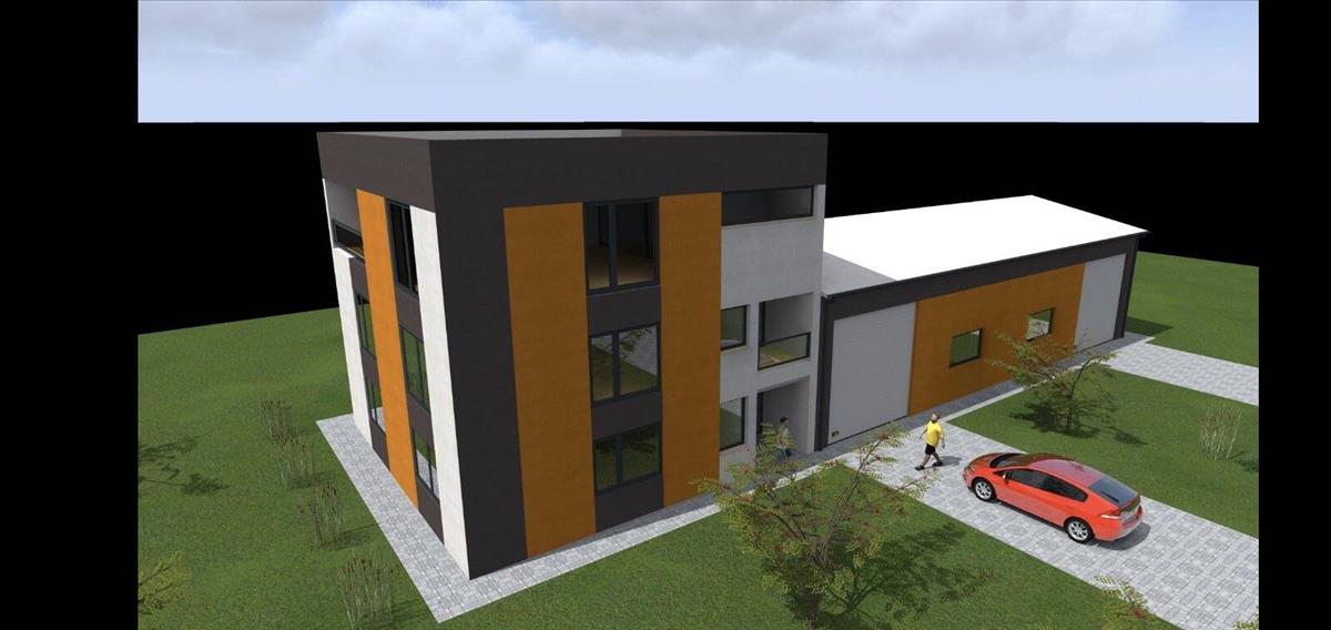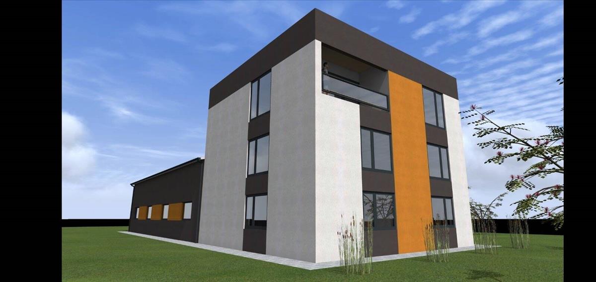 A tervek látványtervek, melyen irodaház és raktár is szerepel.