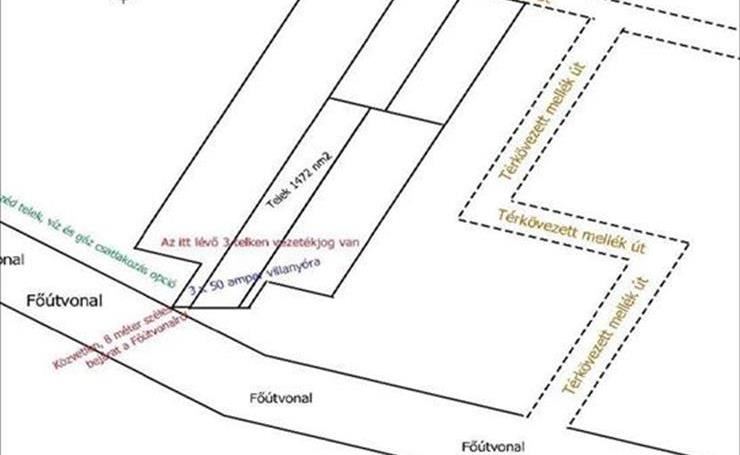 A telek közvetlen aszfaltos utcai bejárattal rendelkezik, amely megkönnyíti az ingatlan megközelítését. Az elektromos áramellátás saját villanyórával biztosított, így azonnal használatba vehető. Továbbá, a szomszédos telekről vezetékes víz és földgáz csatlakozási opció is elérhető, ami további kényelmet és sokoldalúságot nyújt az ingatlan hasznosításához.