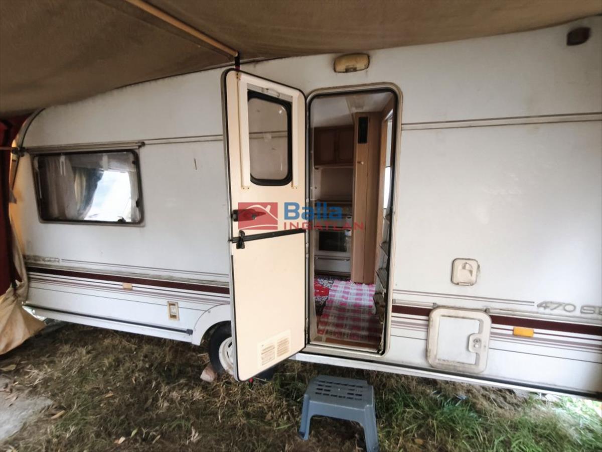 A telken található lakókocsi azonnal használható állapotú, teljes értékű kis nyaralóként funkcionál:
