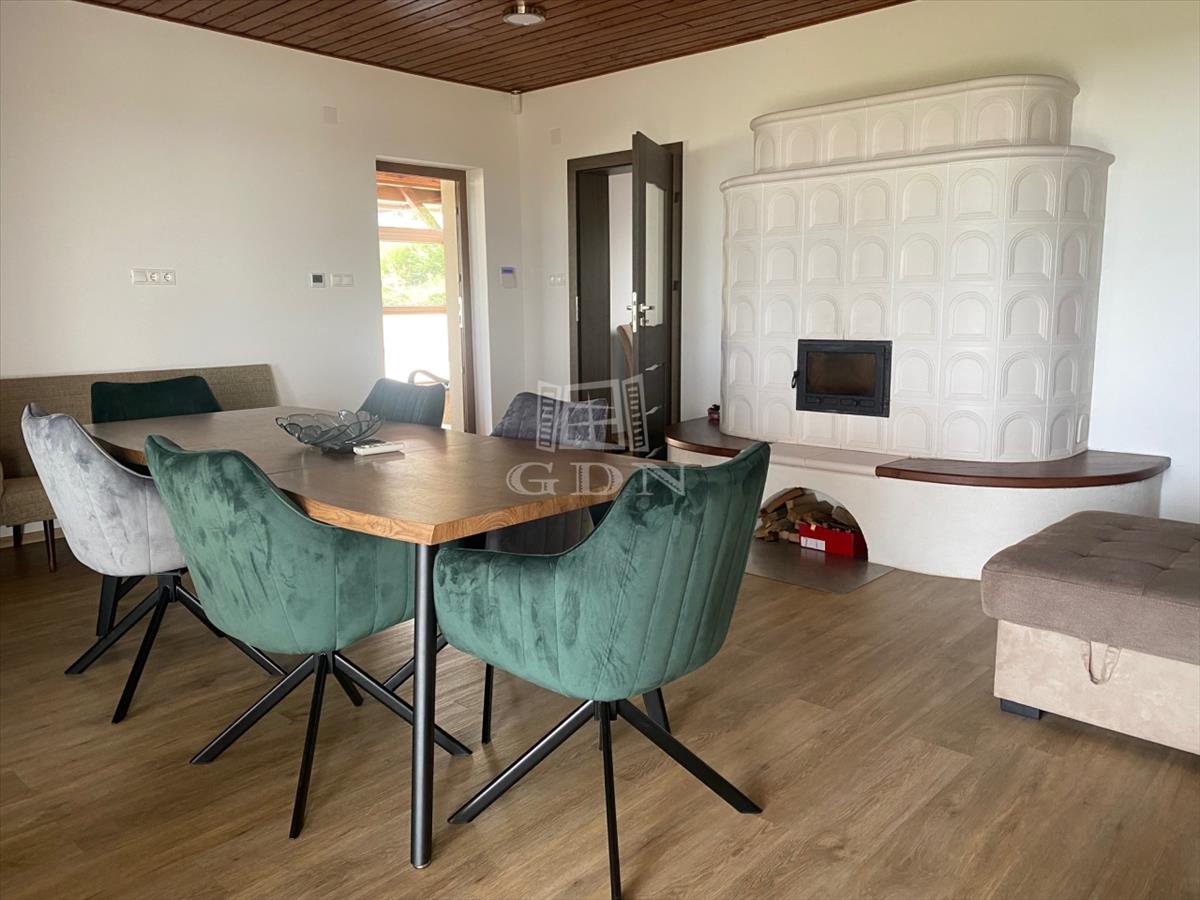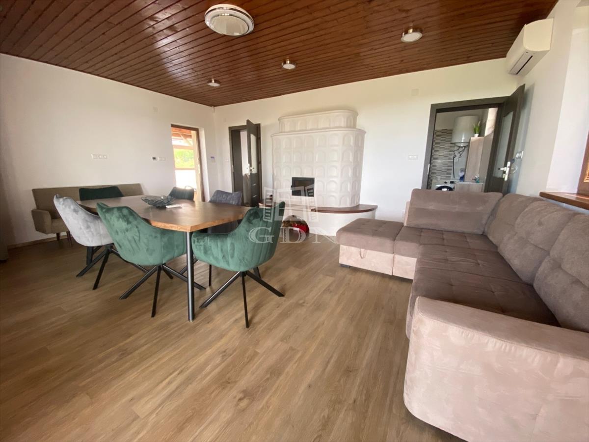 - 100 nm nagyságú téglaépítésű ház. Helyiségei: nappali (29 nm ), konyha (4 nm ), fürdő (6 nm ), szoba (11 nm ), étkező-társalgó ( 50 nm ).