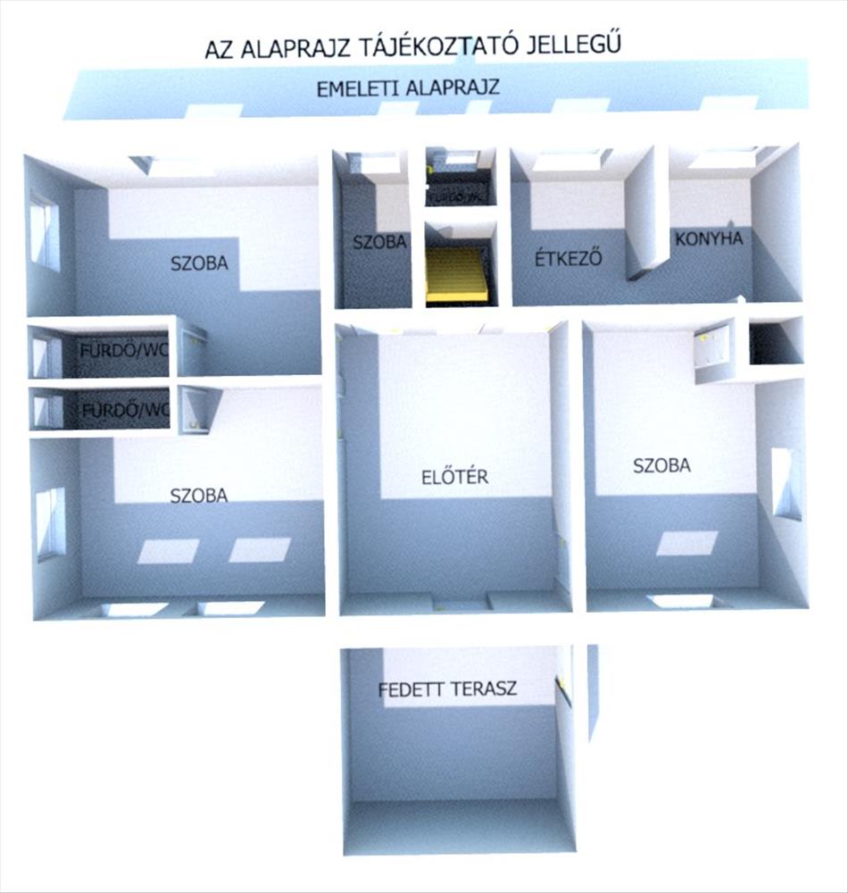 Valamint három vendégszoba. Szobánként saját fürdőszoba /wc és konyha. Ezen a szinten még egy nagy, fedett, napárnyékolóval felszerelt terasz és kiülő került kivitelezésre.