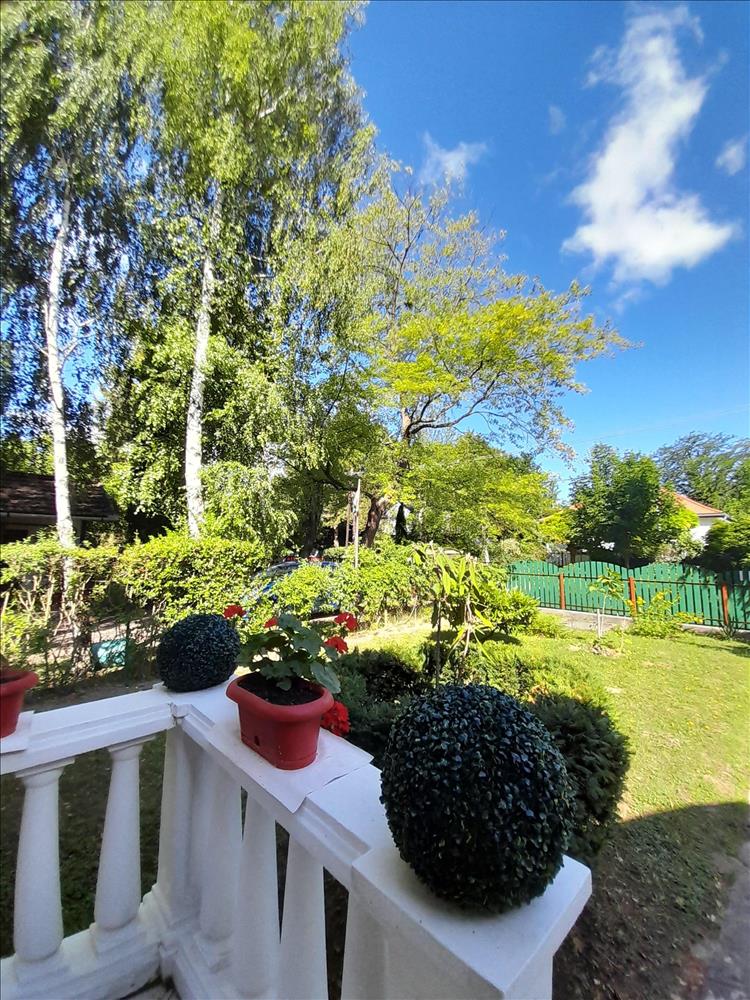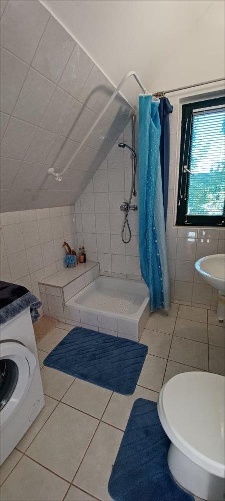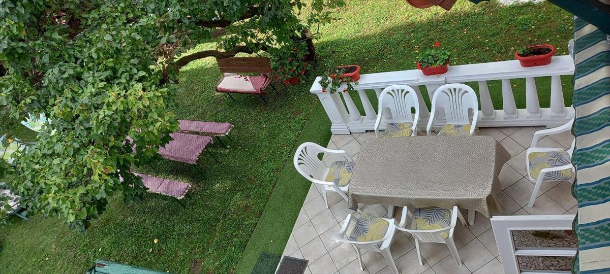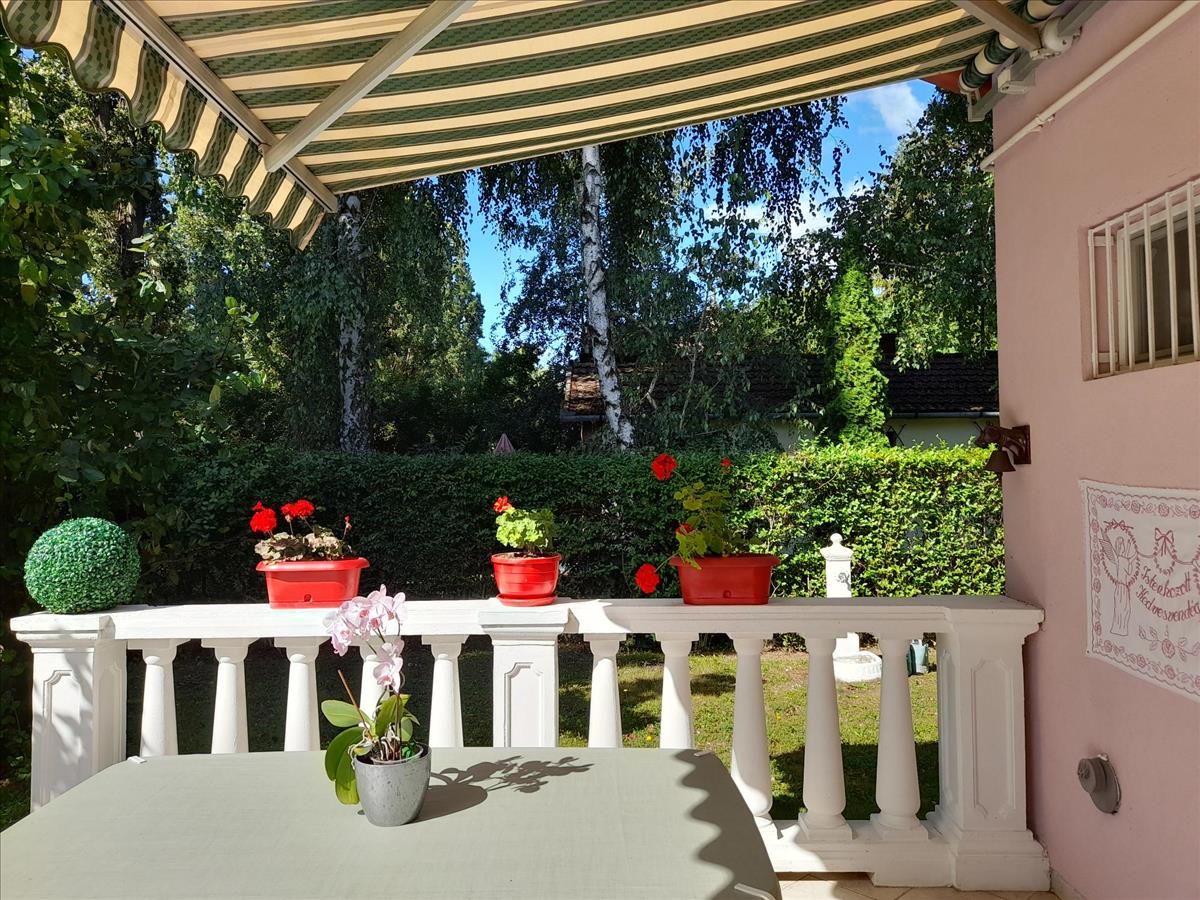 Elől 12 nm-es fedett körterasz, hátul 16 nm-es napárnyékolóval ellátott terasz van. Mindkét szinten három-három helyiség és egy-egy zuhanyzós vécés fürdőszoba található, valamint hűtő-fűtő légkondicionáló, szúnyoghálók, redőnyök. a földszinten konvektoros gázfűtés van a helyiségekben. a fáktól övezett udvarban esőház és két tárolásra is alkalmas faház, valamint grillező található. Bőven van lehetőség több autó parkolására is.