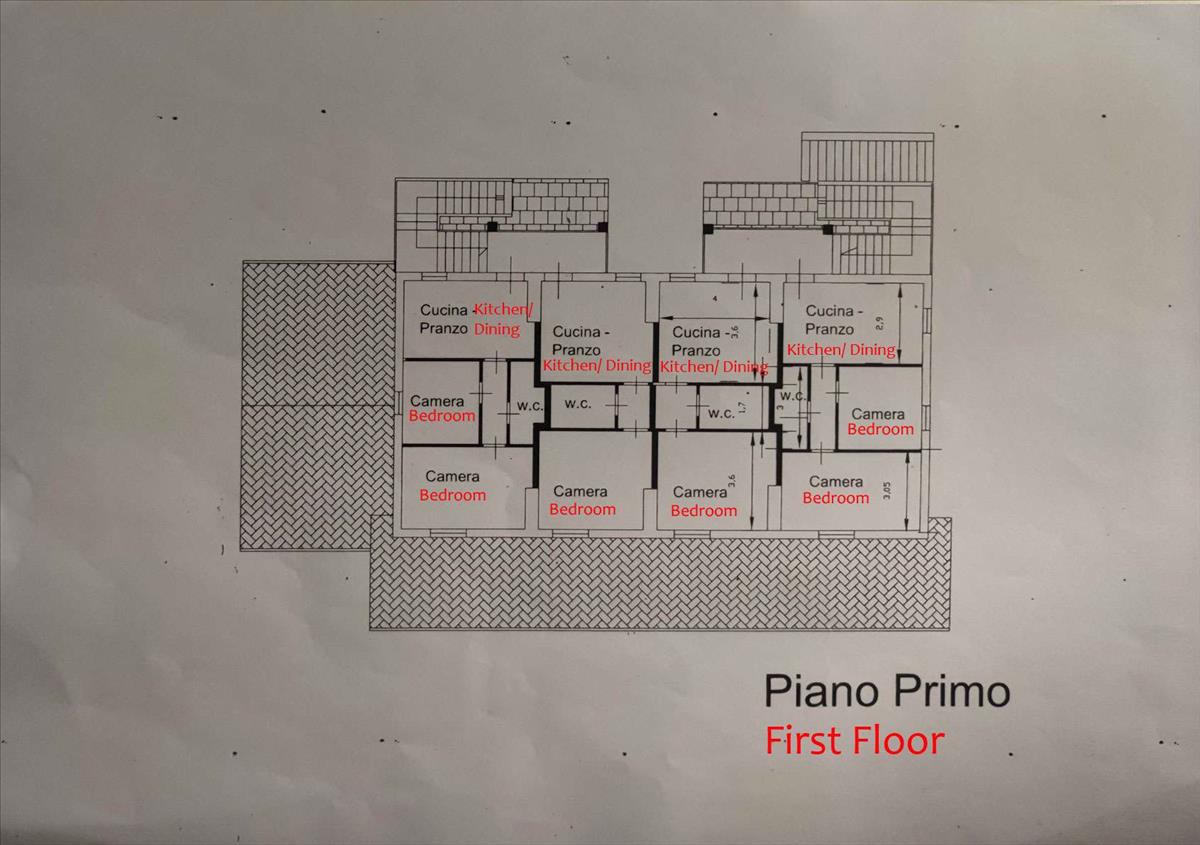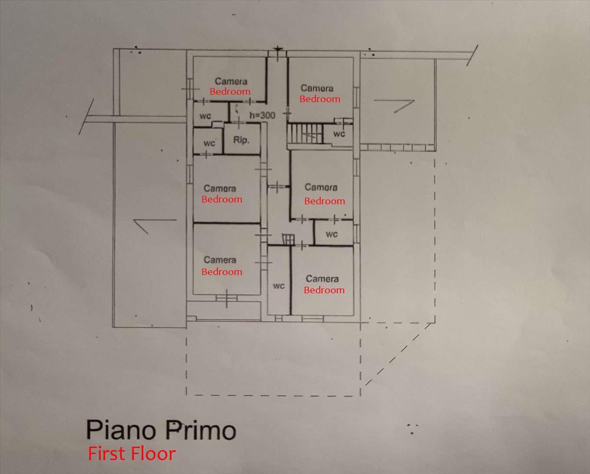 Az első emeleten 6 kétágyas hálószoba található, mindegyikhez tartozik saját fürdőszoba, és van egy lépcső, amely egy kis padláshoz vezet.