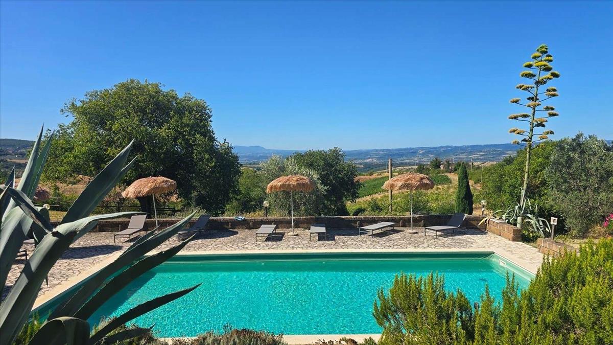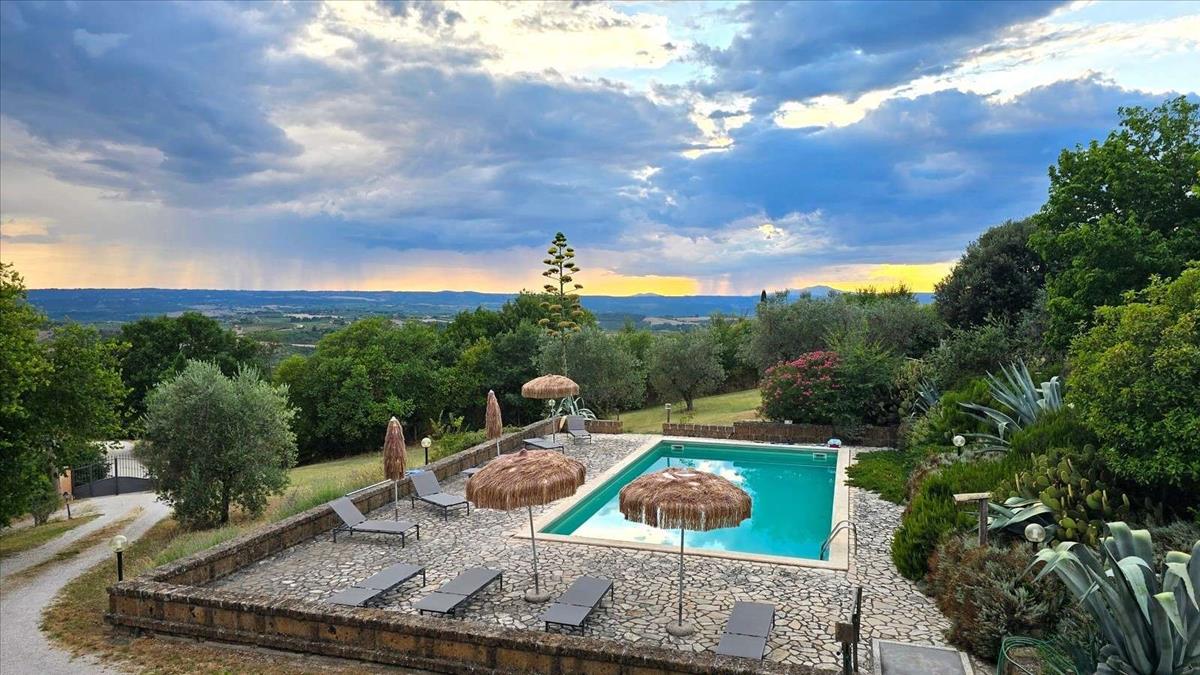 Neked kínálunk egy panorámás és csendes helyet, a gyönyörű Umbria vidéken, félúton Orvieto és Todi között, körülbelül 5 km-re Montecchio és Civitella del Lago ősi falvaitól, egy birtokot két parasztházzal, egy medencével, 3 hektár szőlőültetvénnyel, 100 olajfával, szántófölddel és erdővel.