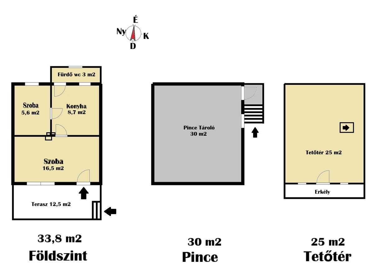 Az épület étkezős konyhával, 2-szobával, és fürdőszobával, részben fedett nagy 12 m2-es terasszal, nagy 30 m2-es alagsori pincével várja új tulajdonosát.