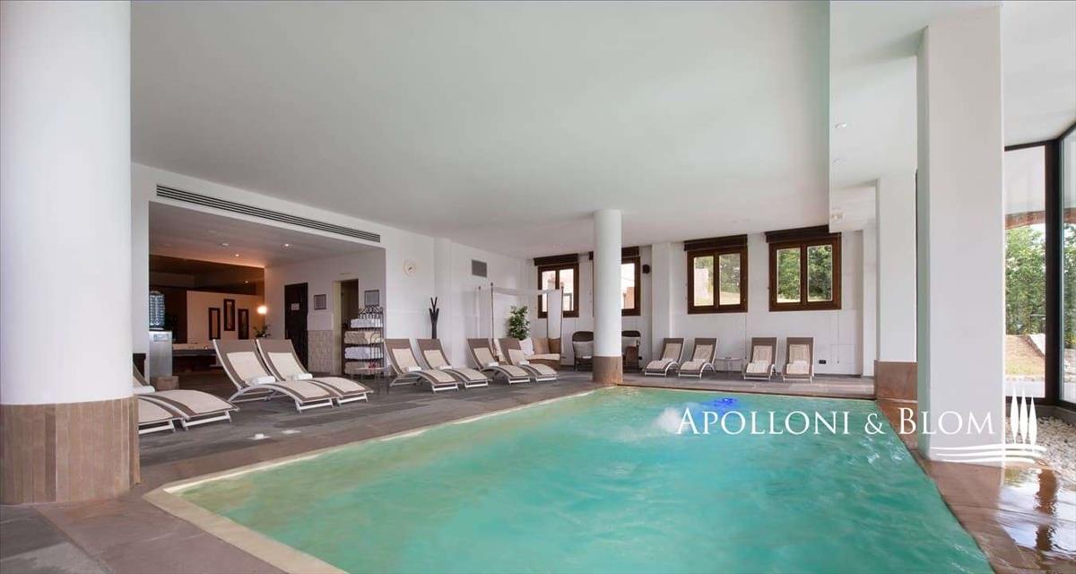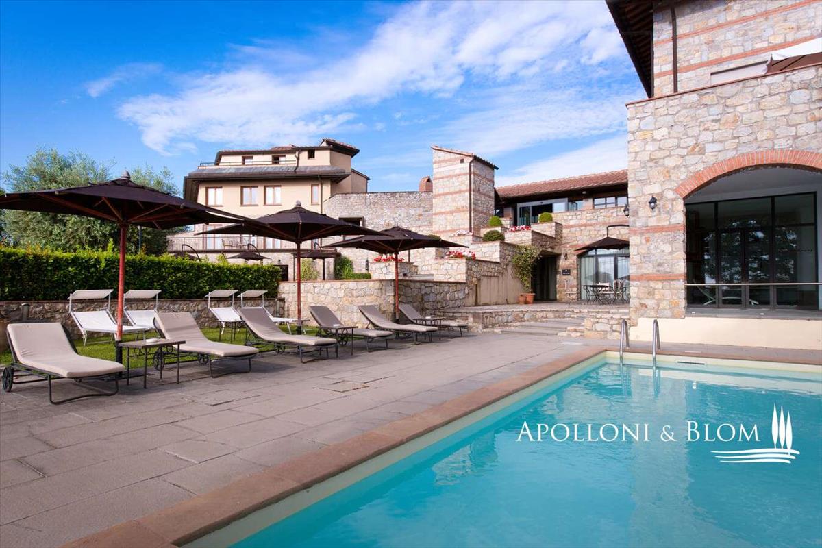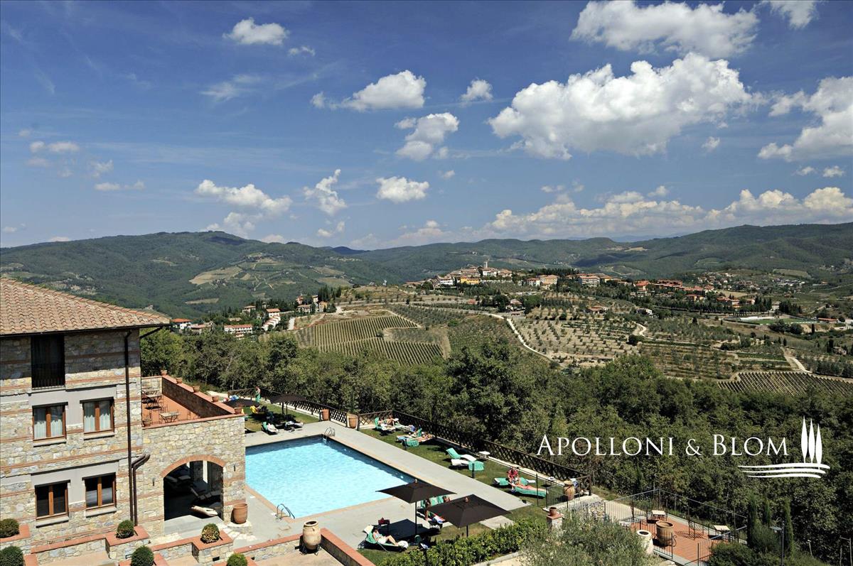Kőház luxus szálloda, spa, medence, park, szőlő- és olajfaültetvény eladó Radda Chianti.