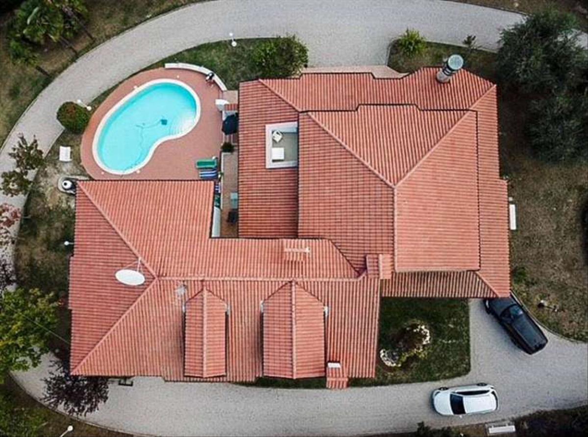 A 484 m²-es villa megközelítése egy kényelmes privát úton történik — a kapuk nyitva, és egy hosszú felhajtó vezet a rengeteg zöld között a lehető legnagyobb magánélethez.