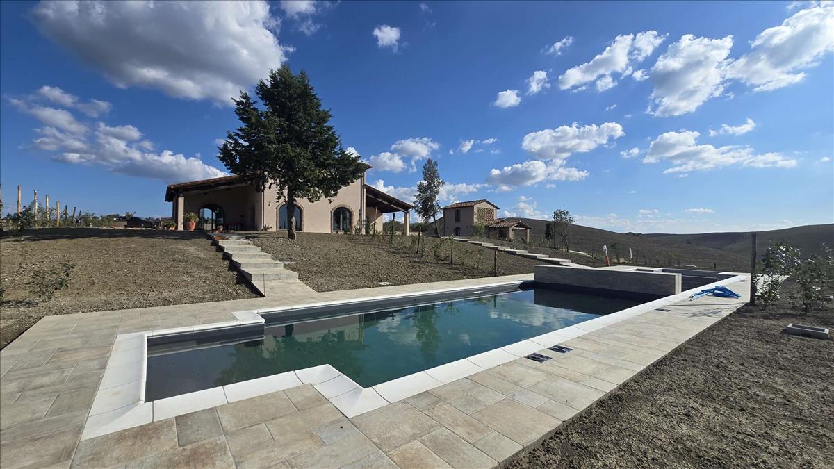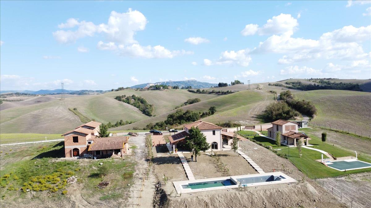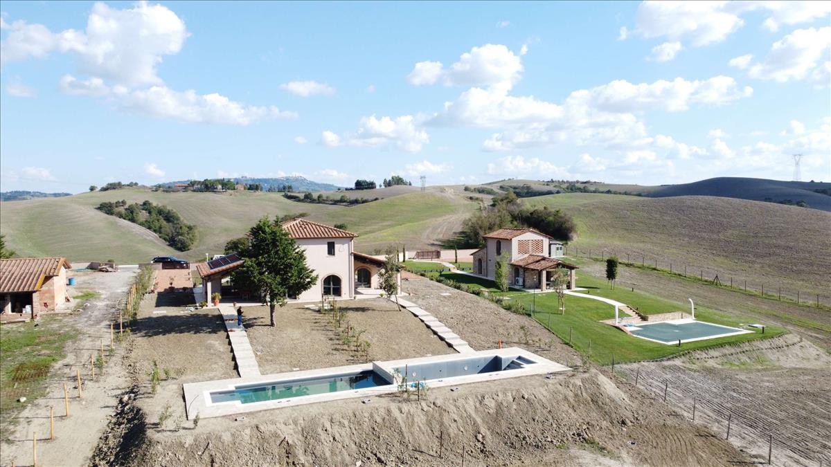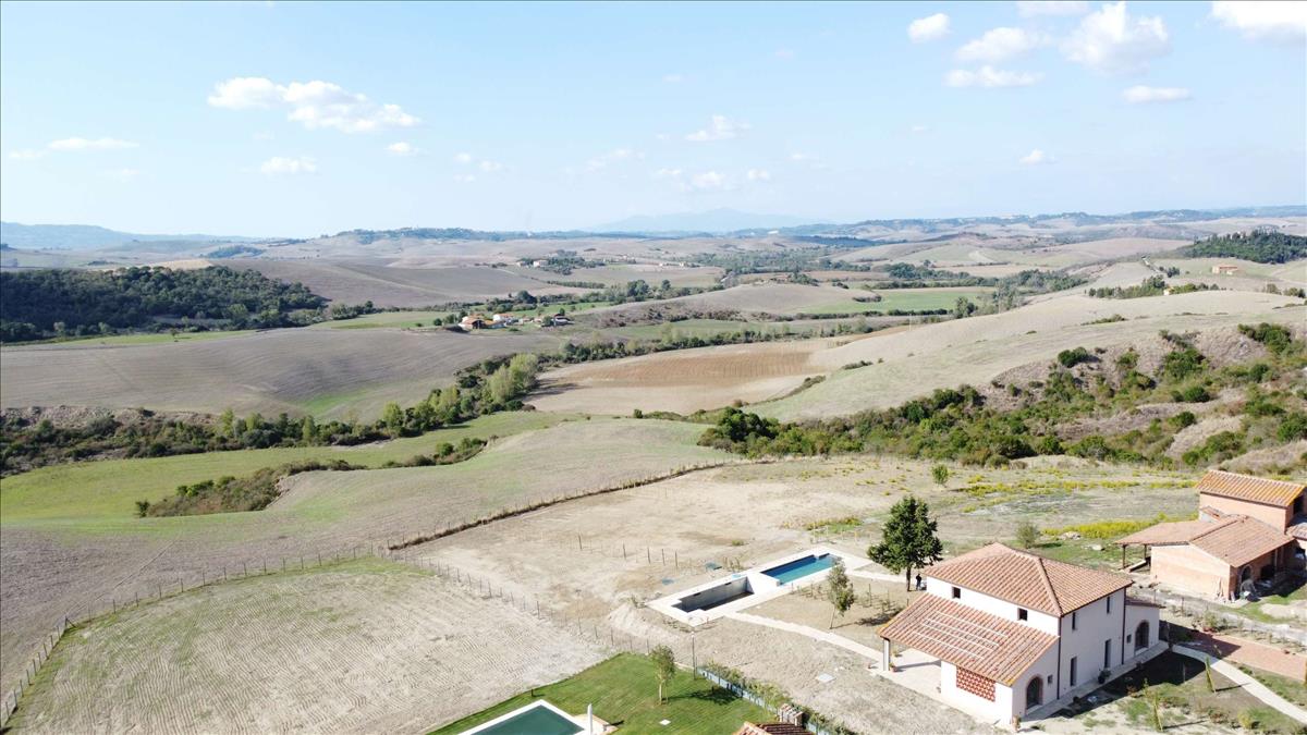 Két félig különálló házat árulunk Volterra és Lajatico között, a hegy tetején, lélegzetelállító panorámás kilátással. A birtok 2 km-es kikövezetlen úton érhető el. Lajatico falu 10 perc autóval, Volterra pedig 15 perc.