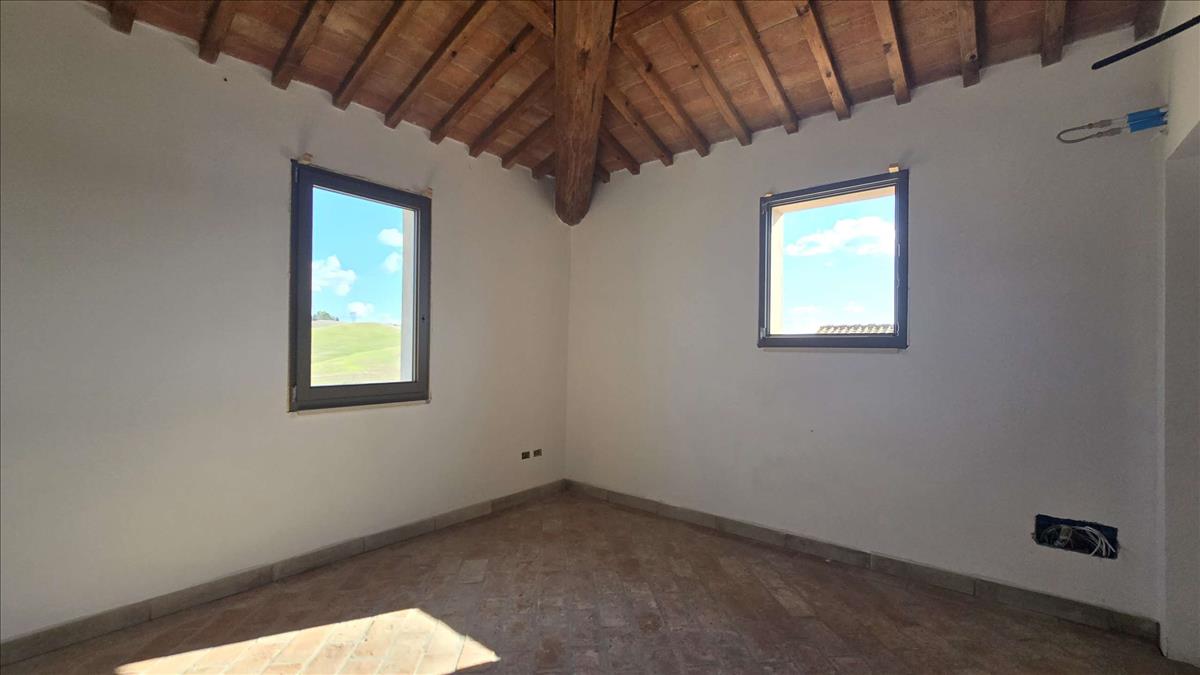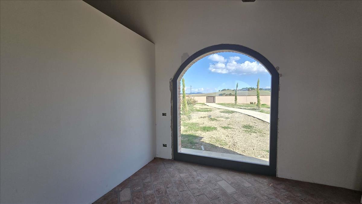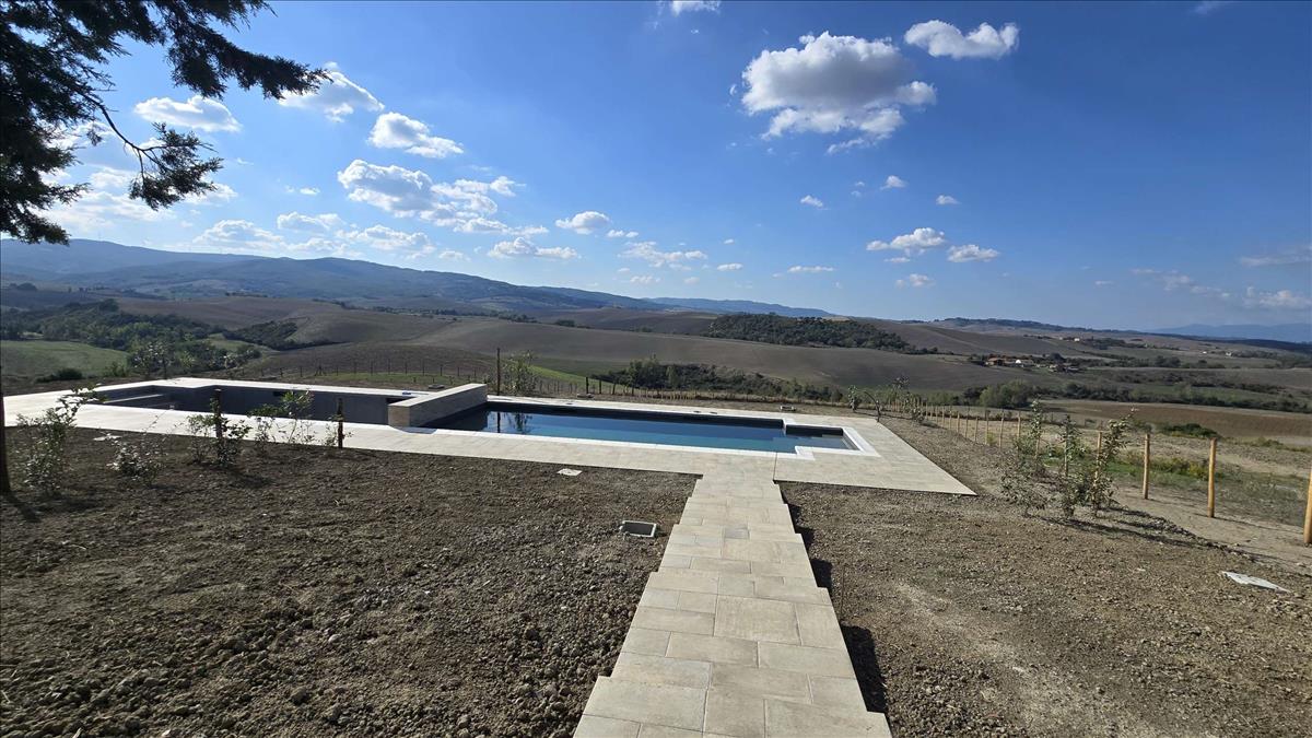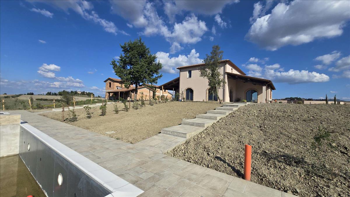 Két félig különálló házat árulunk Volterra és Lajatico között, a hegy tetején, lélegzetelállító panorámás kilátással. A birtok 2 km-es kikövezetlen úton érhető el. Lajatico falu 10 perc autóval, Volterra pedig 15 perc.
