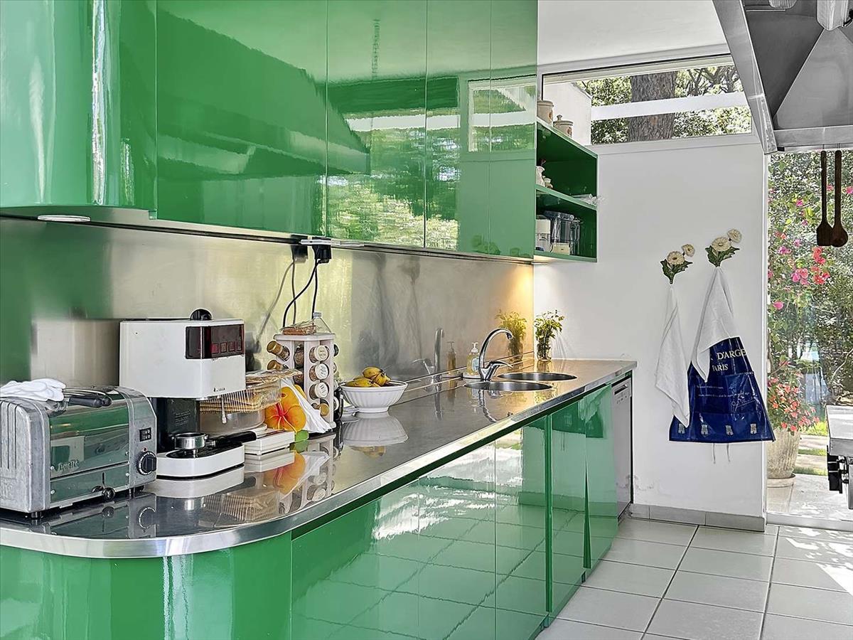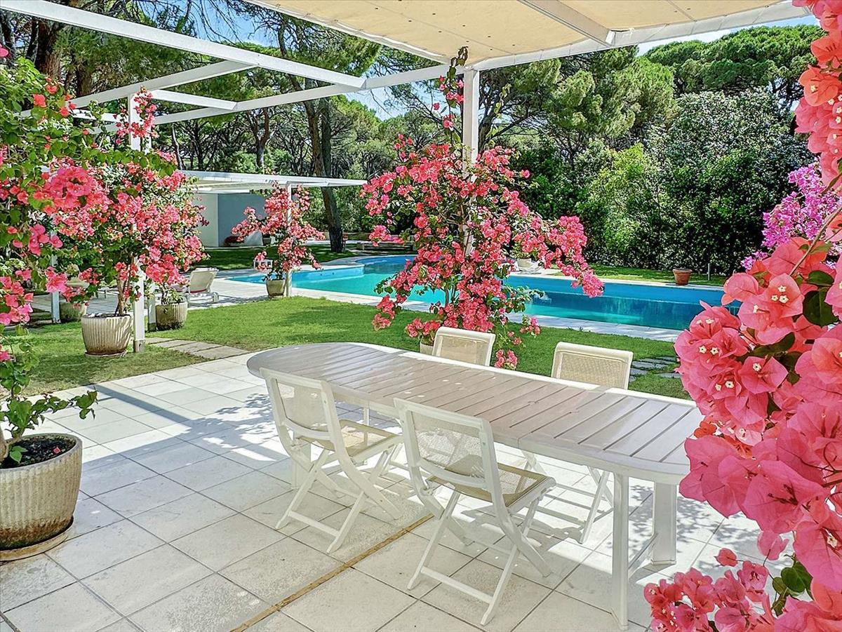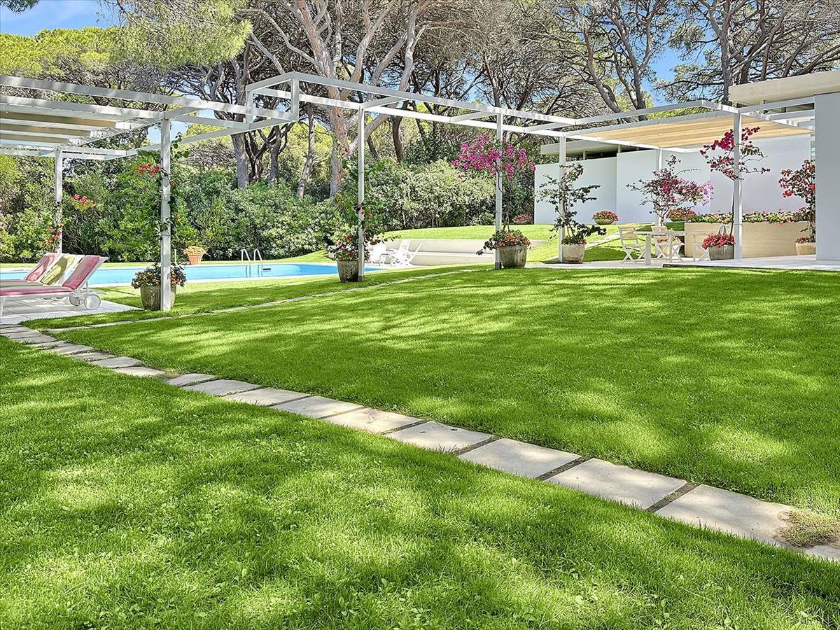 Kívülről a luxus villa egy buja, 6 000 m²-es kertben fekszik, amely tökéletesen ötvözi a környező természetet, az évszázados fenyőket, az aromás növényeket és a színes virágokat. Az ingatlan központjában egy gyönyörű úszómedence található relaxációs területtel, bársarokkal és forró vízzel ellátott szabadtéri zuhanyzóval. A villát körülvevő teraszok számos szabadtéri ülőhellyel és egy nagy étkezőasztallal kínálnak, ideális a zöldben töltött kellemes pillanatokhoz. A fehér szerkezet dominanciája elegáns kontrasztot teremt a környező növényzettel. A villában található egy felhajtó, amely a lakókocsi felé vezet, és van egy gyalogos bejárat a könnyű közvetlen hozzáférés érdekében. Minden szabadtéri hely úgy van kialakítva, hogy maximális kényelmet és magánéletet biztosítson, kizárólagos pihenést nyújtva. Csak 500 méterre található a saját strand, amely 2 km-re nyúlik, és állandó megfigyelésnek köszönhetően továbbra is fenntartott és csendes. Egy kunyhó és egy bungaló tölti ki a tengerparti élményt.
