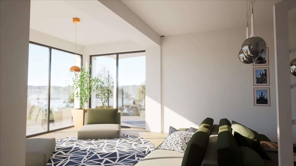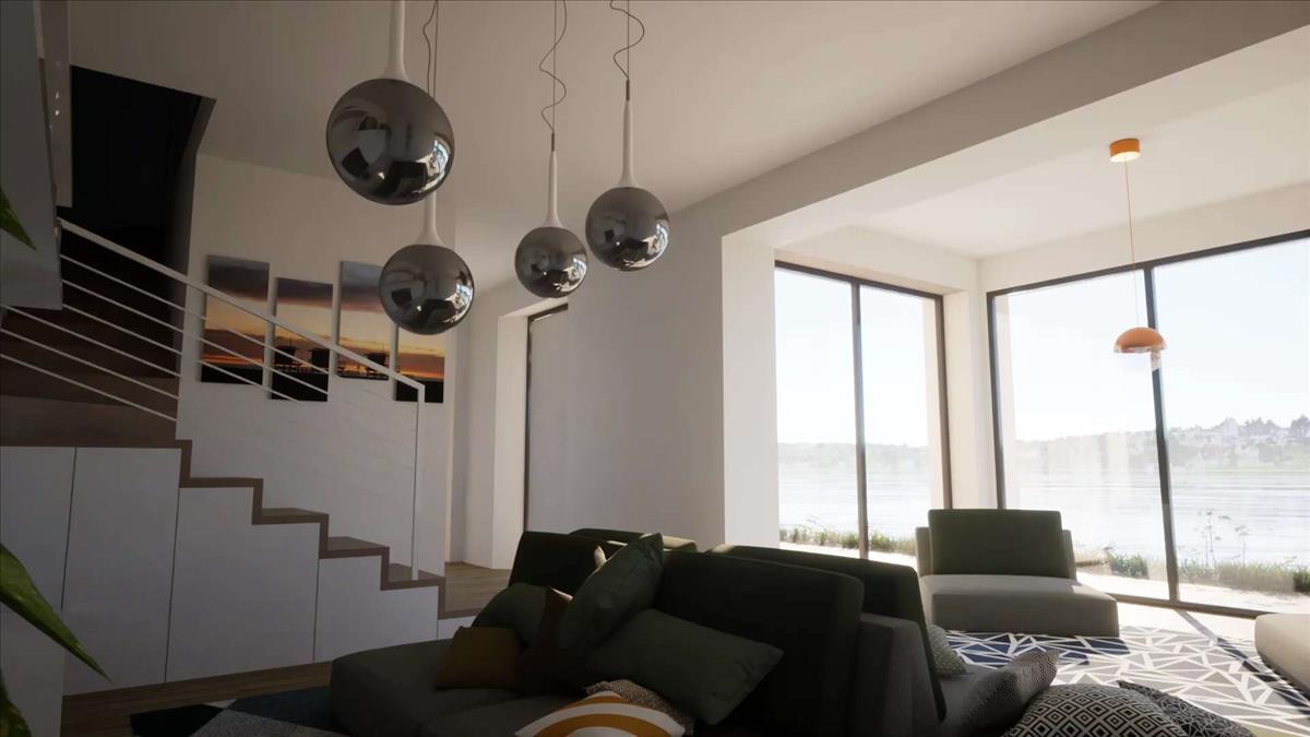 Földszint: a villa dobogó szíve kétségkívül a nappali, amely tágas és világos a nagy ablakoknak köszönhető, amelyek közvetlenül a tóra néznek.