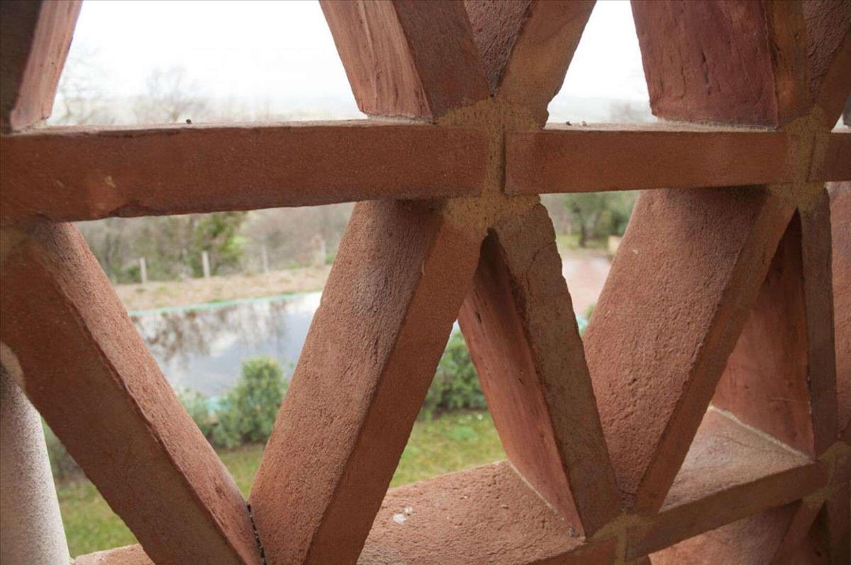 Kétemeletes épület, világító homlokzatokkal, amelyek a jellegzetes tetők színét terrakotta csempével és téglával hangsúlyozzák, íves nyílásokkal és külső lépcsőkkel loggiával.
