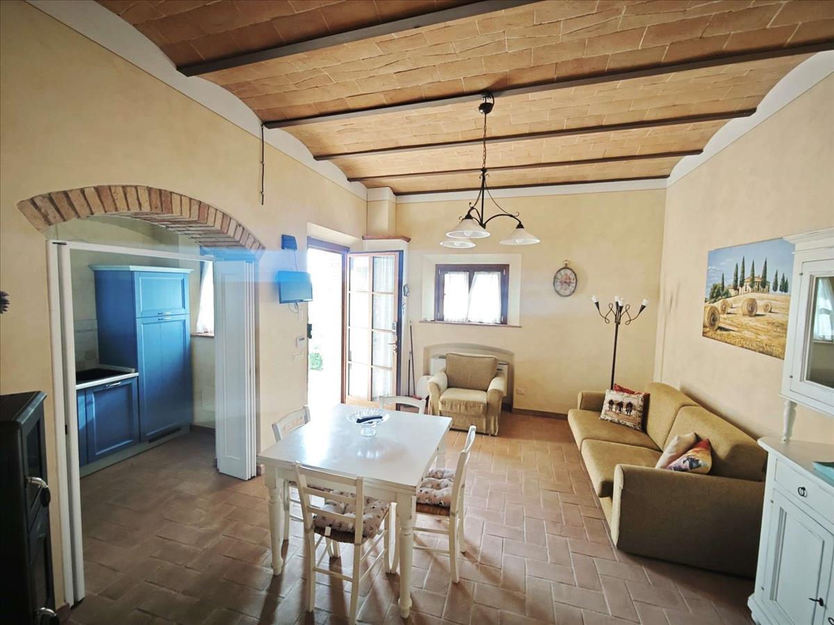 Az eladó apartman a földszinten található, alapterülete 63 m², és a következőkkel bír: nappali–konyha nyílik egy szép teraszra, ahol lélegzetelállító panoráma nyílik Volterrára és a környező dombokra, és ahol felejthetetlen naplementét élvezhet; 2 fürdőszoba és egy kétágyas hálószoba.