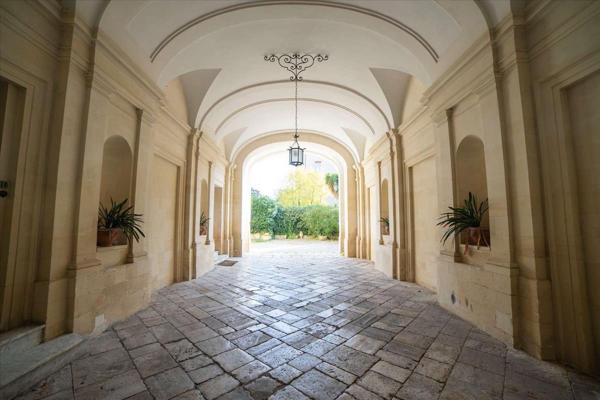 A Lecce kőből épült palota homlokzata felett egy fenséges zöld portálon egy oroszlánfejű kopogtató áll, amely a hatalmas bejárathoz vezet, boltíves mennyezettel és díszes szobákkal, valamint egy tágas recepciós csarnokkal, amely akár hat autót is befogadhat, és közvetlen hozzáférést biztosít a kertekhez.