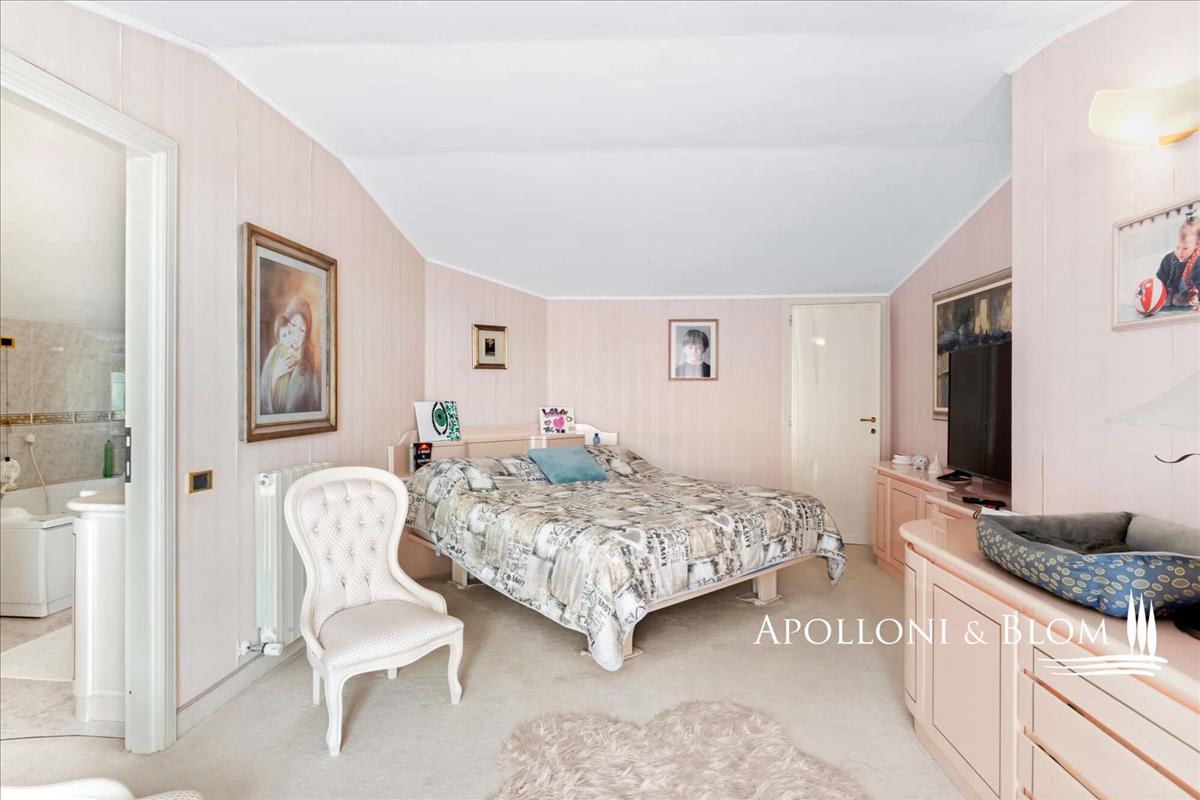Az első emeleten egy kétszemélyes hálószoba kilátással a 300 m²-es teraszra, és egy másik hálószoba, fürdőszoba és fedett veranda található.