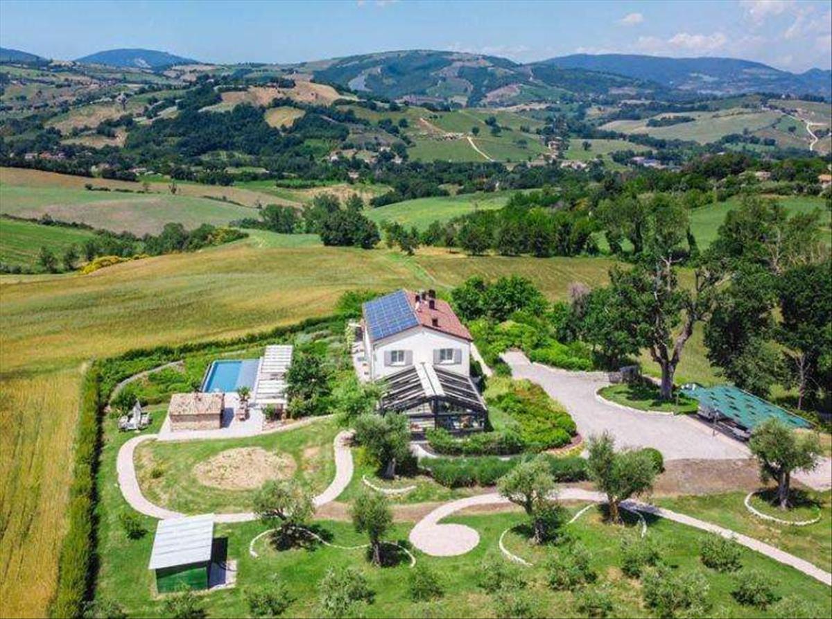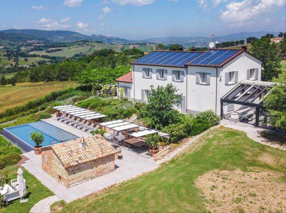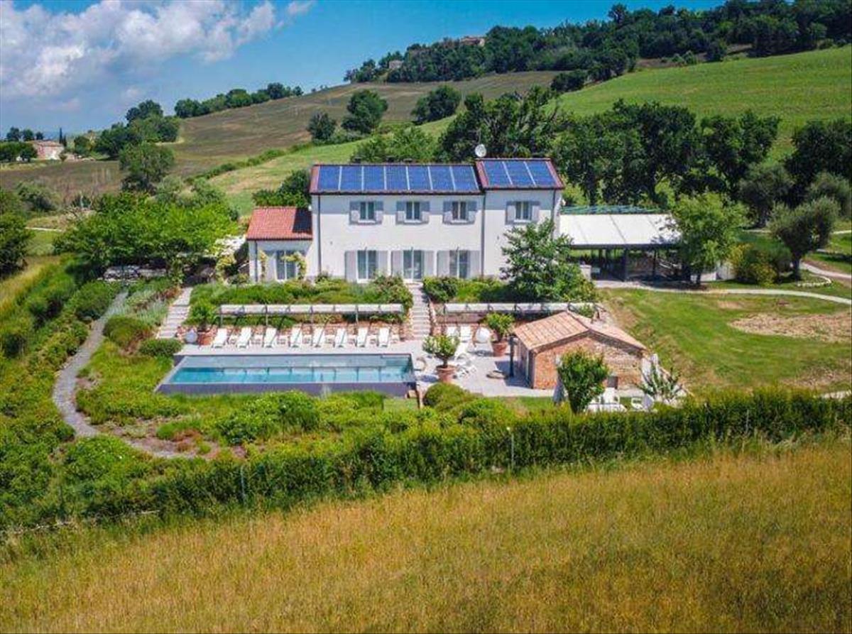 Ez a luxus villa egy hihetetlenül különleges, 5 hálószobás családi ház, 555 m². A hely a marchigiano gördülő dombok között található. Jelenlegi tulajdonosai jelentős felújítást végeztek mind a házon, mind a kerteken, hogy neked szenzációs családi otthont adjanak, amely olyan, mint egy nagy vidéki ház, és minden kényelmet biztosít, amit csak el tudsz képzelni. A panorámás végtelen medence, a beltéri medence, a szauna, a török fürdő és az otthoni mozi is része.