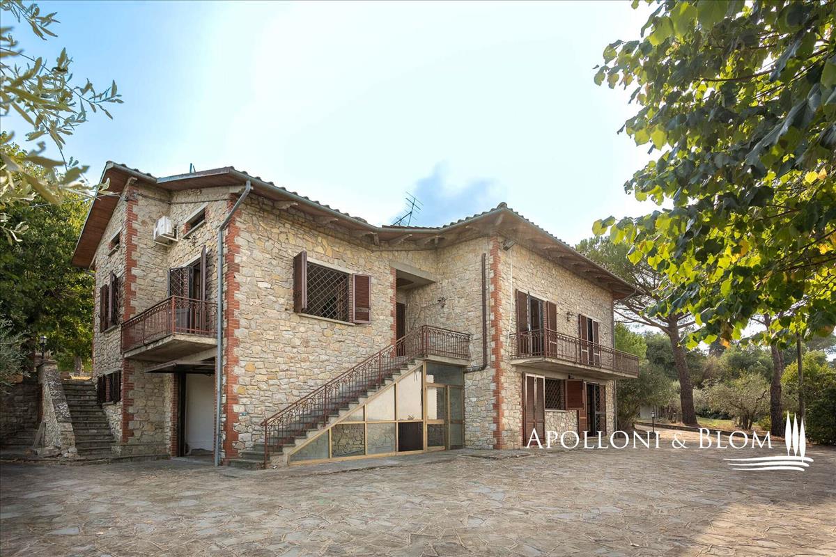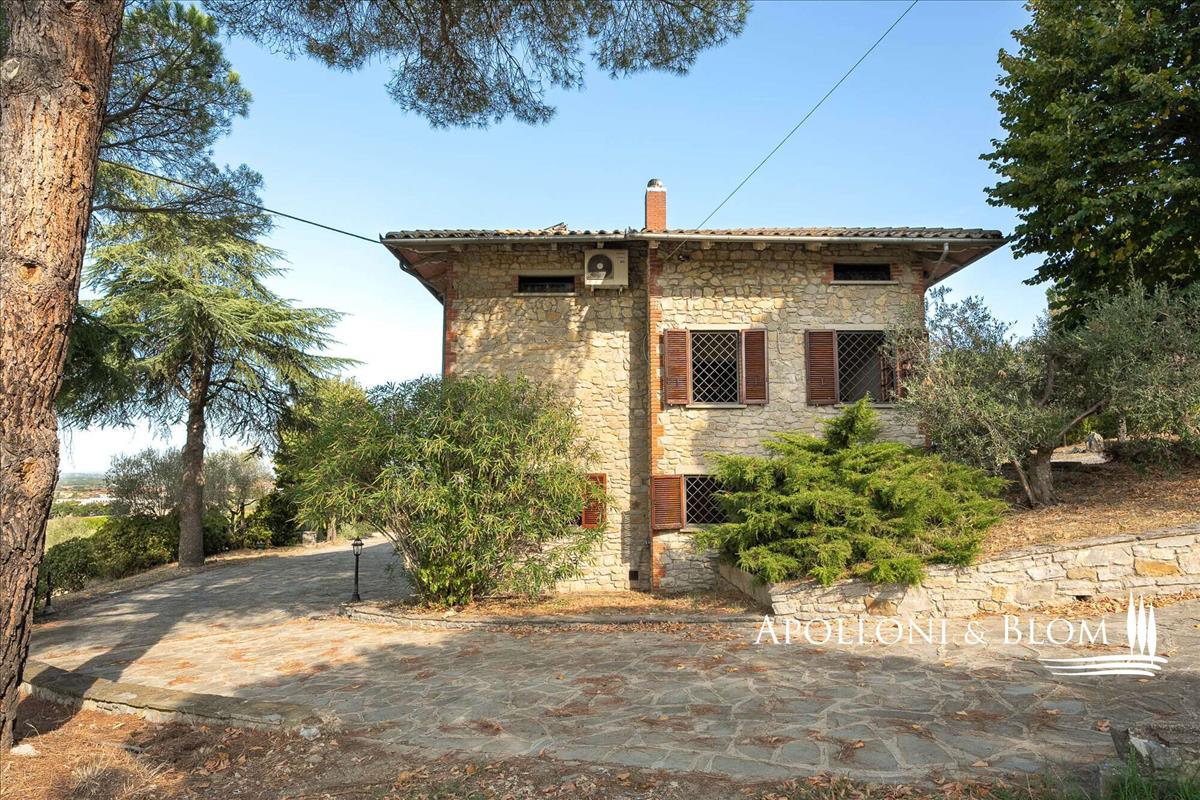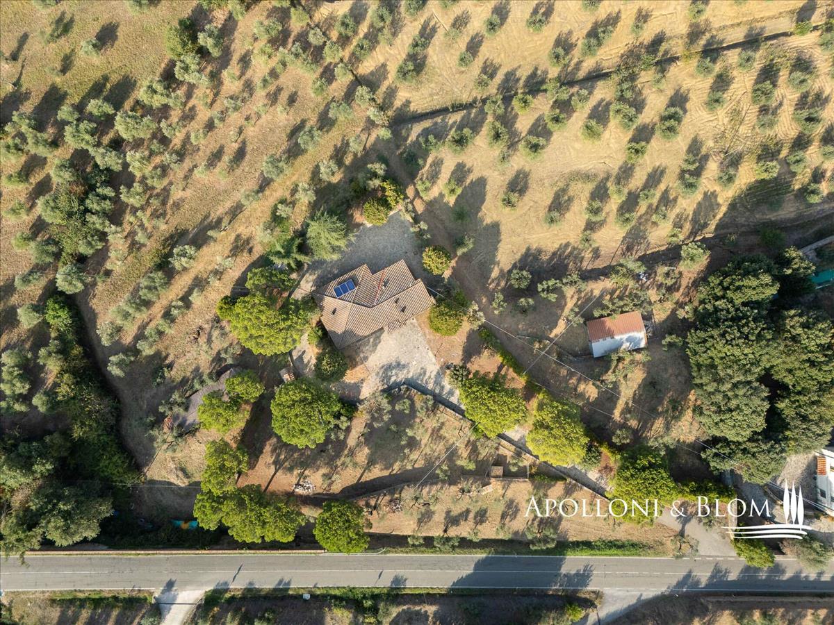 Kővilla négy hálószobás, légkondicionált, napelemekkel felszerelt, két hektár földdel és olajfaligettel eladó Cortona közelében. A hely a Val di Chiana vidékén, a Trasimeno-tónál és Cortona középkori városának közelében található, egy kellemes, domináns környezetben.