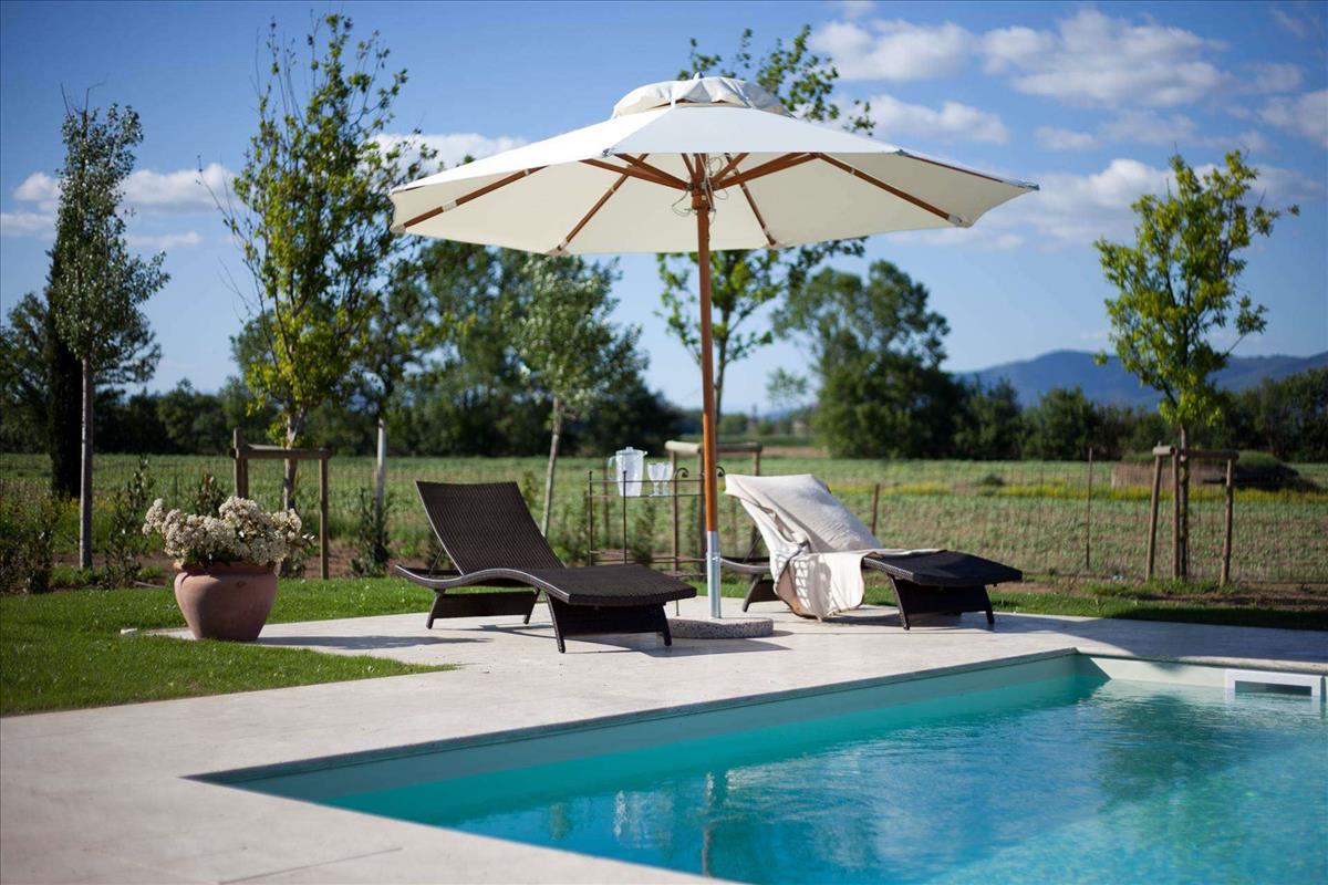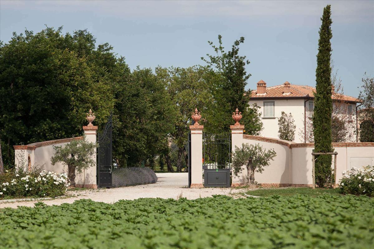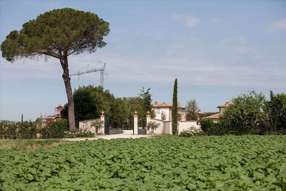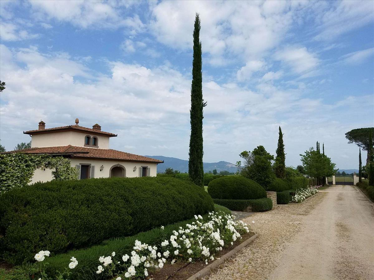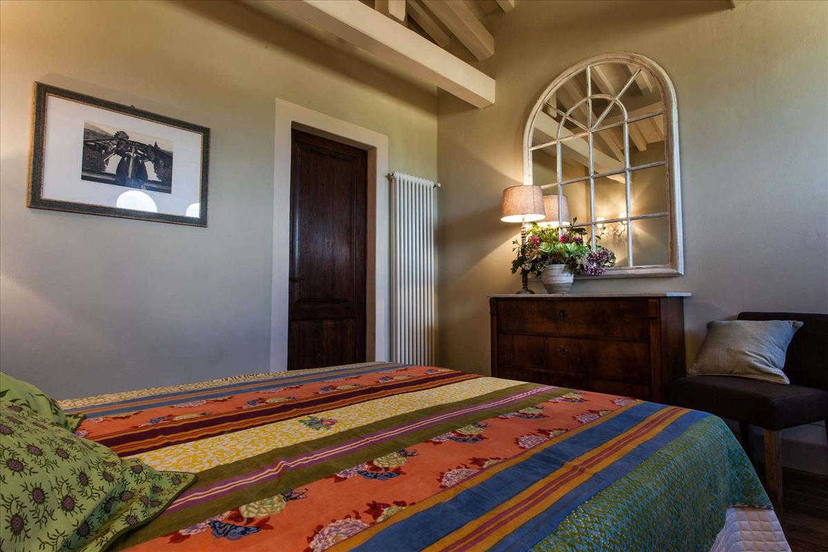 Elegáns parasztház panorámás tornyokkal, 4 hálószoba, 3 fürdőszoba, nagy nappali, étkező, konyha, eladó Cortonában.