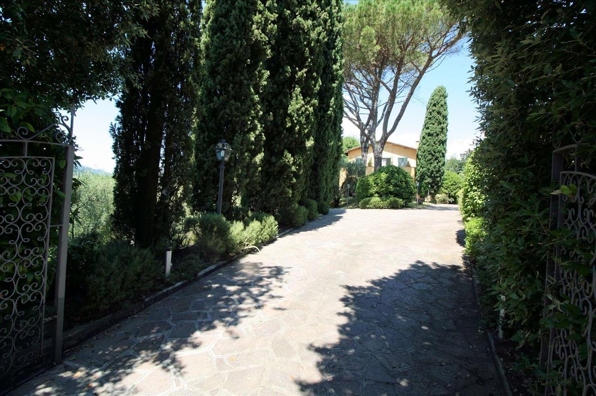 A villa megközelítése egy fával bélelt úton keresztül történik, ciprusokkal és sövényekkel, amelyek kiemelik az épületet.