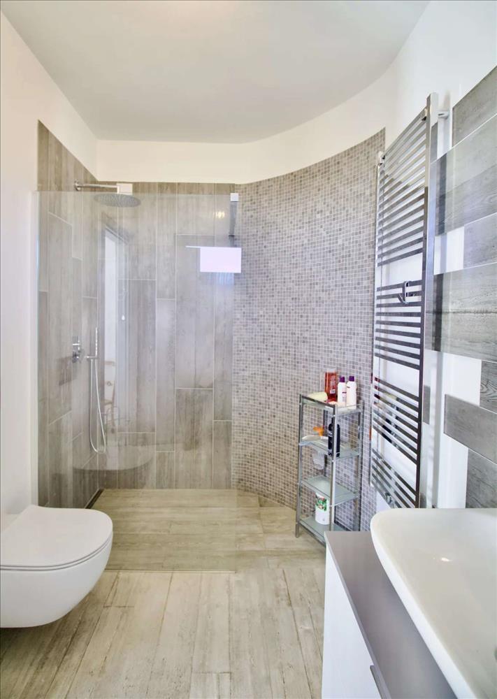 Egy tágas első emeleten vár rád a nyitott nappali, amely a déli kilátás felé nyílik, így fantasztikus panoráma nyílik a zöld dombokra és az azúr tengerre. Magas minőségű befejezések, fa mennyezet és dupla üvegezésű ablakok teremtik meg a világos és barátságos hangulatot.