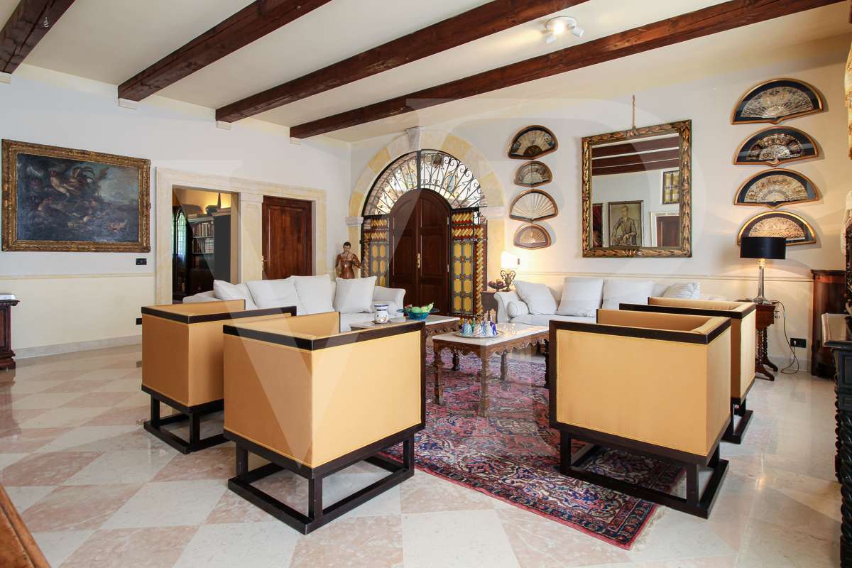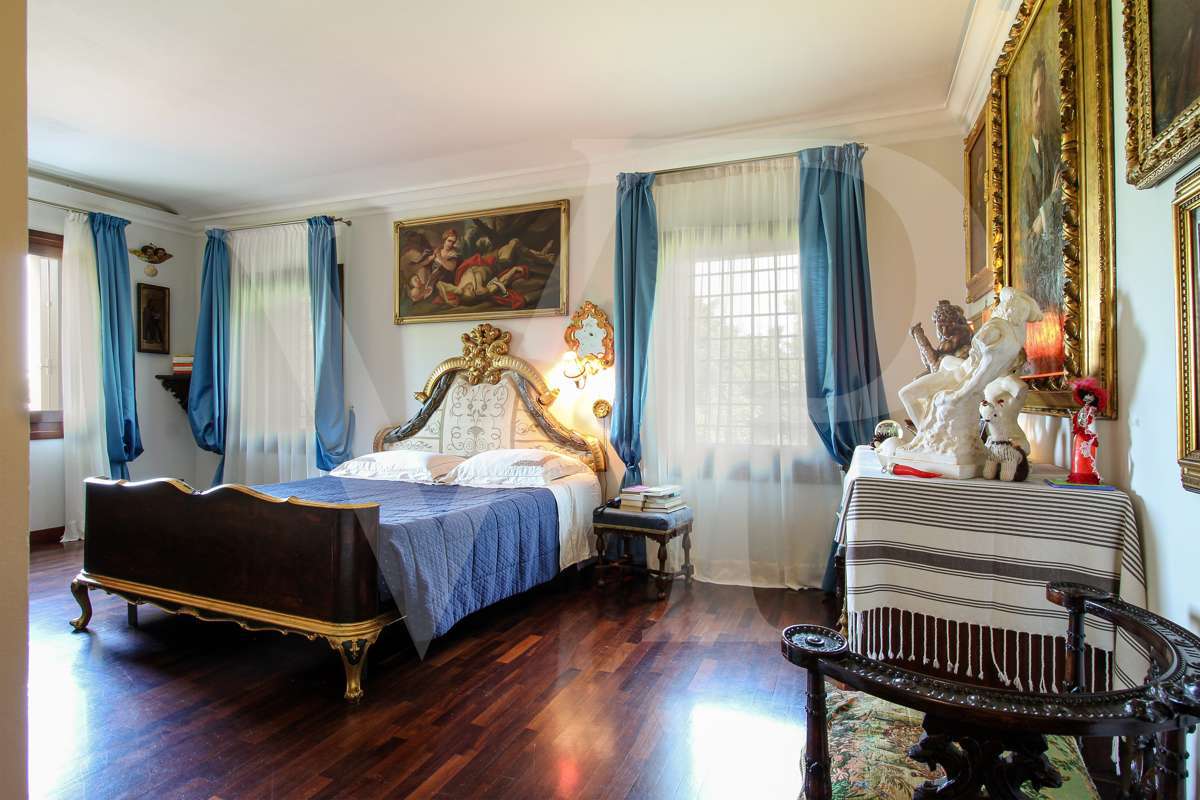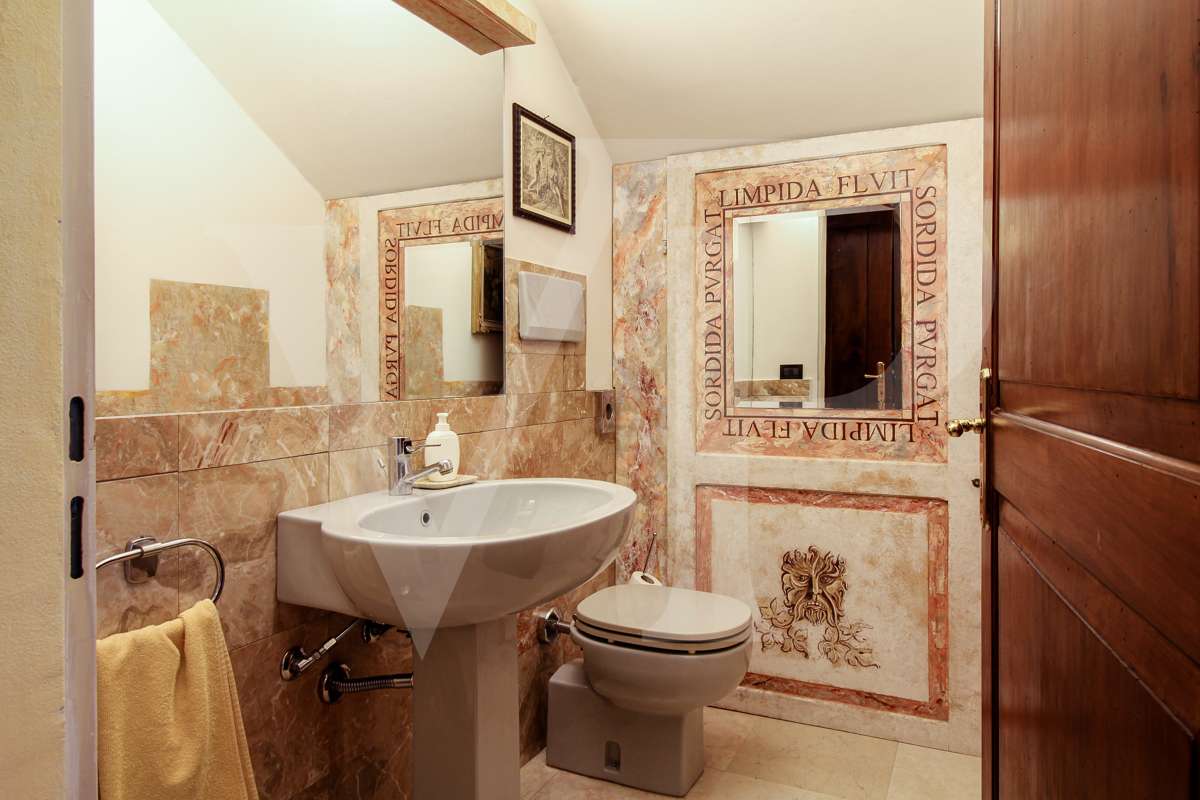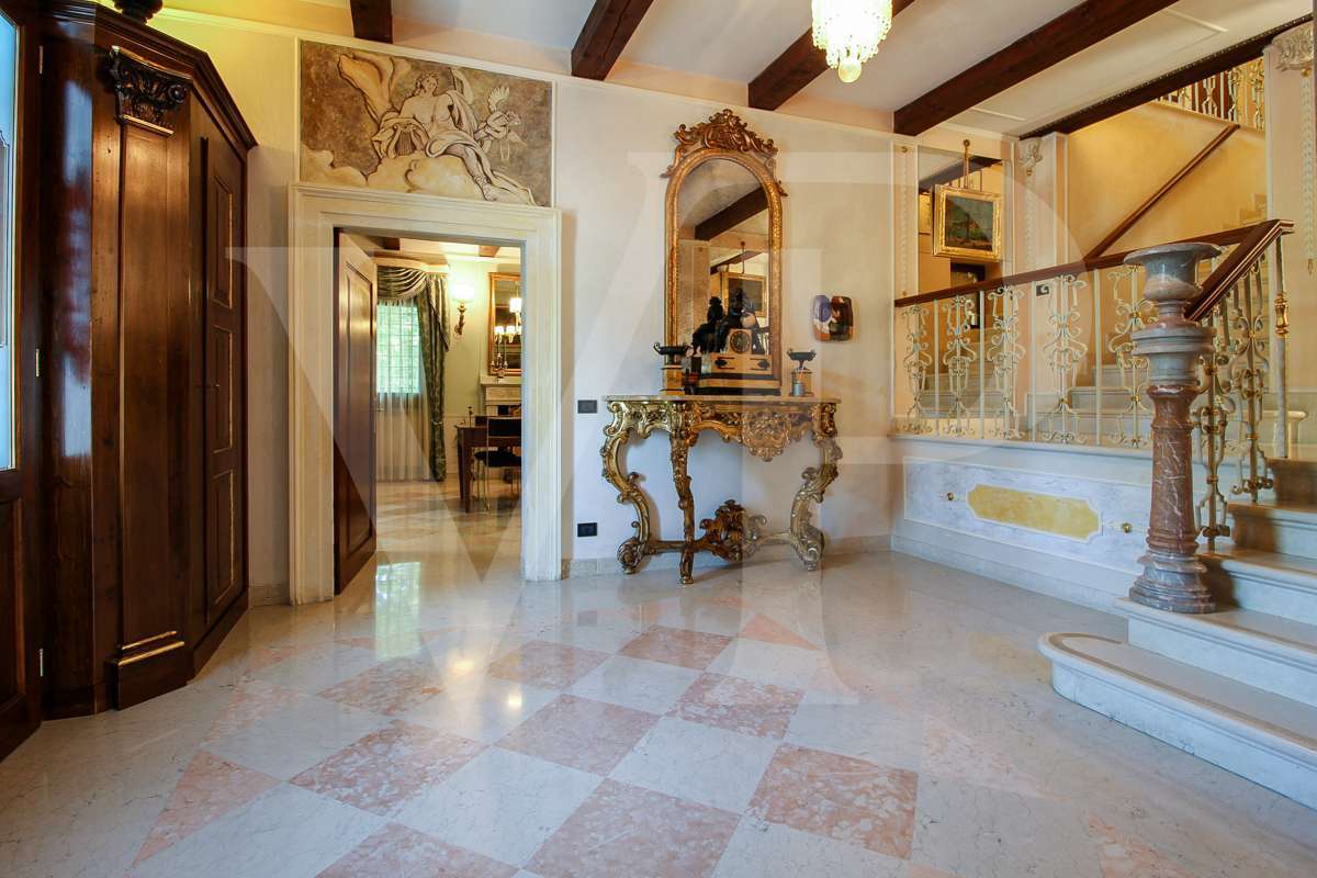 A villa főbejárati ajtajától láthatók azok a részletek, amelyeket a felújítás során felhasználtak: a padló, a falak és a fürdőszobák stílusa, az antik ajtók, valamint a gazdag freskók, amelyek az ingatlan ragyogását és nemességét adják.