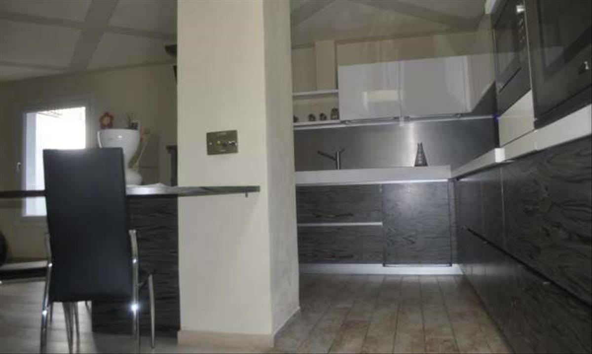 Egy belső lépcső vezet a felső emeletre: a földszinten nappali-konyha és fürdőszoba, az első emeleten pedig 3 hálószoba és egy fürdőszoba található.