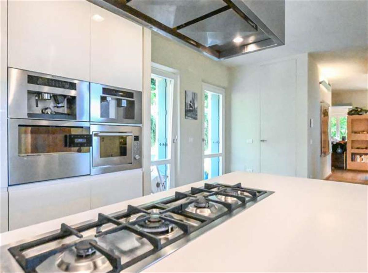 A világos konyha a családi nappalira nyílik; a konyhát pedig számos francia ajtó köti a kertre néző két pergolához, így a belső és a külső tér egymásba folyik.