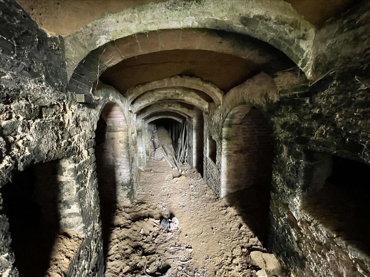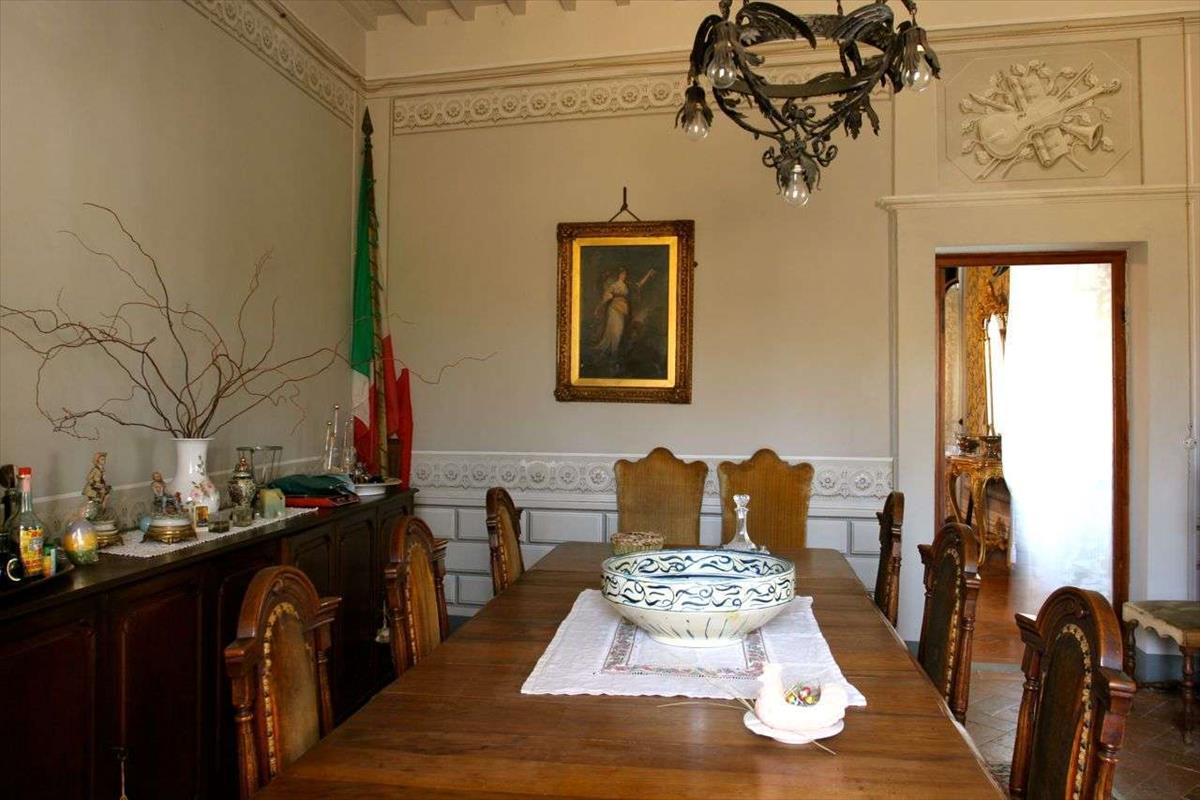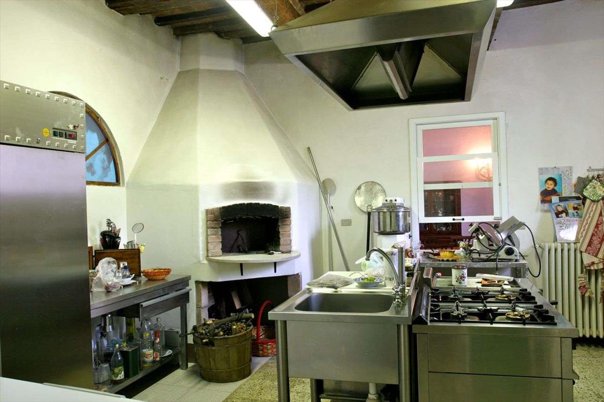 Földszinten a bejárati előtér, az ipari konyha zsilippel az étkezőhöz, egy kis étkező freskós mennyezettel és falakkal, a nagy étkező keresztezett mennyezettel, a szervizfürdőszoba, négy beépített szekrény közül az egyik kazánházként szolgál, és egy nagy garázs, több mint 50 m².