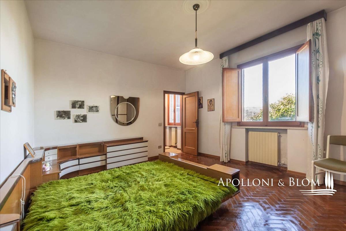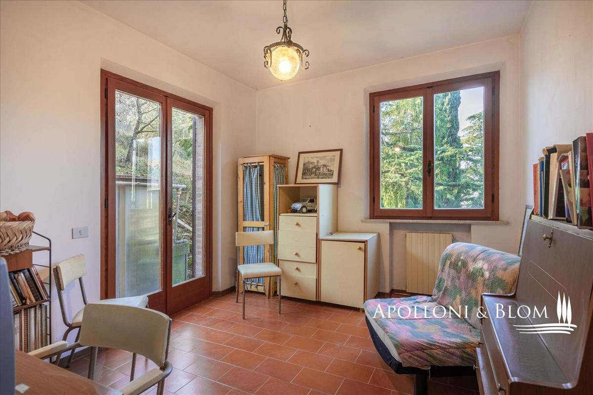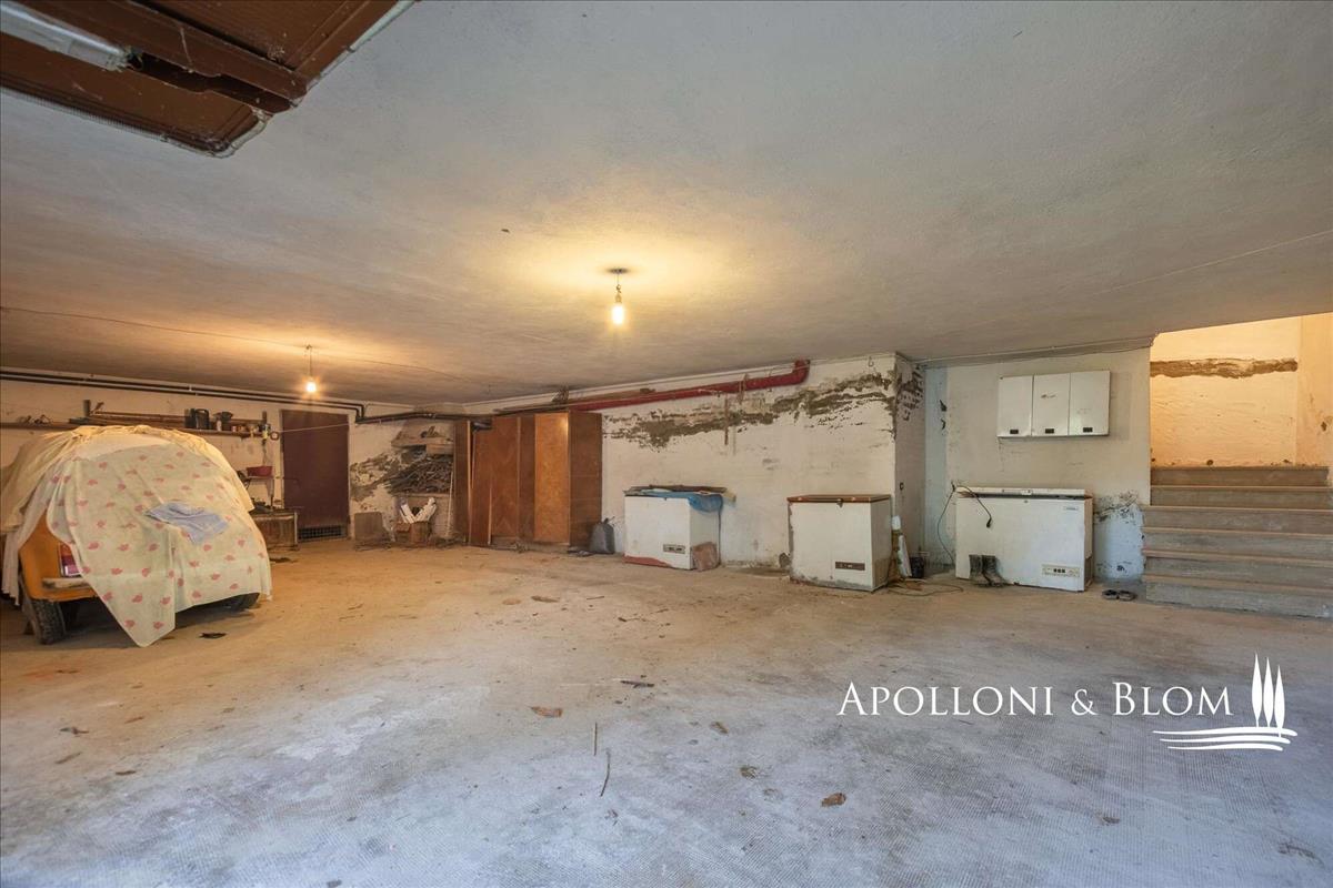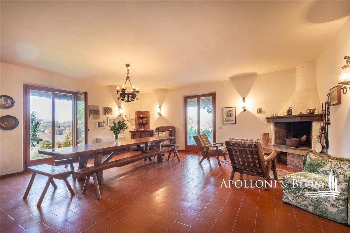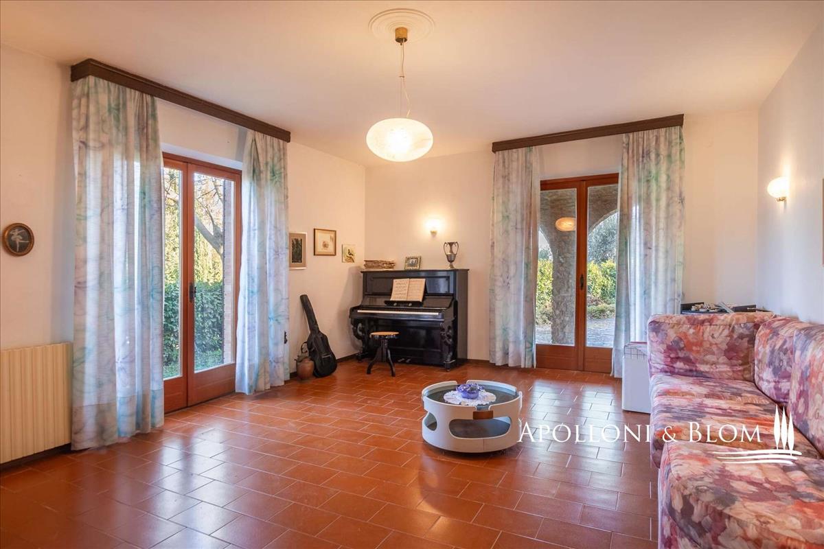 Az ingatlan háromszintes, és 362 m²-es életteret kínál, a 87 m²-es pince és garázs társaságában. Az 1976-ban épült villa a hagyományos toszkán építészet meleg jellegét ötvözi a kőből készült részletekkel, tágas loggiákkal és kandallókkal, mindez átgondolt elrendezéssel. Földszinten egy üdvözlő bejárat után könyvespolcok vezetnek egy nagy, fényárban úszó nappaliba.