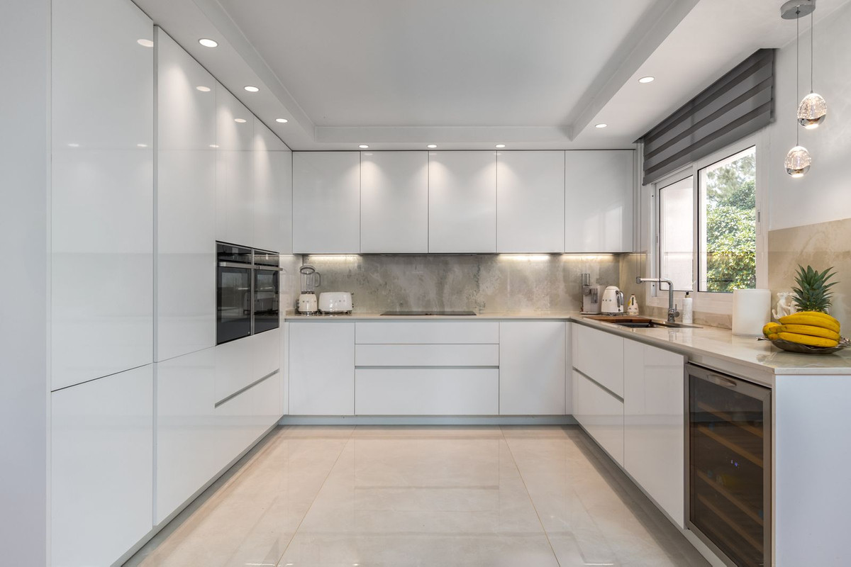 * Tágas nyílt terű nappali modern konyhával és nagy ablakokkal nyílik a kert és a terasz