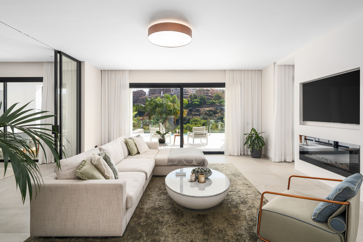 Minden emelet könnyedén áramlik a következő, expanzív teraszok hozzáférhető minden hálószoba és közös területek. Kültéri terek közé tartozik a fedett medence, saját barbecue zóna, és szauna - ideális szórakoztató, családi élet, vagy csendes pihenés. Panorámás kilátás nyílik a Santa Maria Golf kurzus és a Földközi-tenger erősíti a villa & apos; s elsődleges pozicionálási és nyugodt légkört.