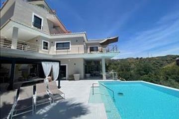 Egy egyedülálló ingatlan található az első sorban a Santa Maria golfpálya lélegzetelállító kilátással a tengerre. Ez a nagy villa (468m2 lakótér és 200m2 erkélyek és teraszok) egy nagy telek 1335m2 teljesen felújított a legmagasabb szintű. 7 Hálószoba, egy iroda és 8, 5 fürdőszoba. Mivel a domboldalon található, a villa 5 emeletre oszlik, amelyek elérhetők a beltéri lift.A legfelső emeleten (szint + 1 utcai szinten) egy iroda (vagy hálószoba) található csodálatos kilátás nyílik a tengerre. a felhajtón, egy napelemes lakókocsival, van hely 2 autónak. Az utca szintjén, a garázs 2 autó található egy elektromos autó töltő, valamint az egyik fő bejárata a ház. Itt található a sportraktár és a mosókonyha. Továbbá van 2 hálószoba és egy fürdőszoba található ezen a szinten. Ez könnyen átalakítható egy au-pair vagy inas apartman erkéllyel. a hálószoba szintje -1-es szinten található. Itt található 3 hálószoba, mind ensuite fürdőszobával, valamint a nagy hálószoba csodálatos kilátás nyílik a tengerre, egy nagy séta-a szekrényben és egy csodálatos mester fürdőszoba, egy ingyenes fürdő, üveg mennyezettel és kilátással a tengerre, dupla zuhanyzók, külön wc és bidé. a nappali a 2-es szinten található. Itt egy másik főbejárat a ház található, valamint egy hálószoba ensuite fürdőszoba, a ruhatáras és egy másik raktár. a nappali egy nyitott terv a konyha, ahol a 6méteres üveg tolóajtó biztosít közvetlen hozzáférést a terasz pavilon és szabadtéri konyha és a nagy végtelen medence. Végül a bónusz a villa talál -3 szinten az otthoni mozi bár, a tornaterem és a fürdő gőzfürdővel, szauna és egy extra fürdőszoba. Kívül ezen a szinten találsz egy füves mezőt a napozóágyakkal.