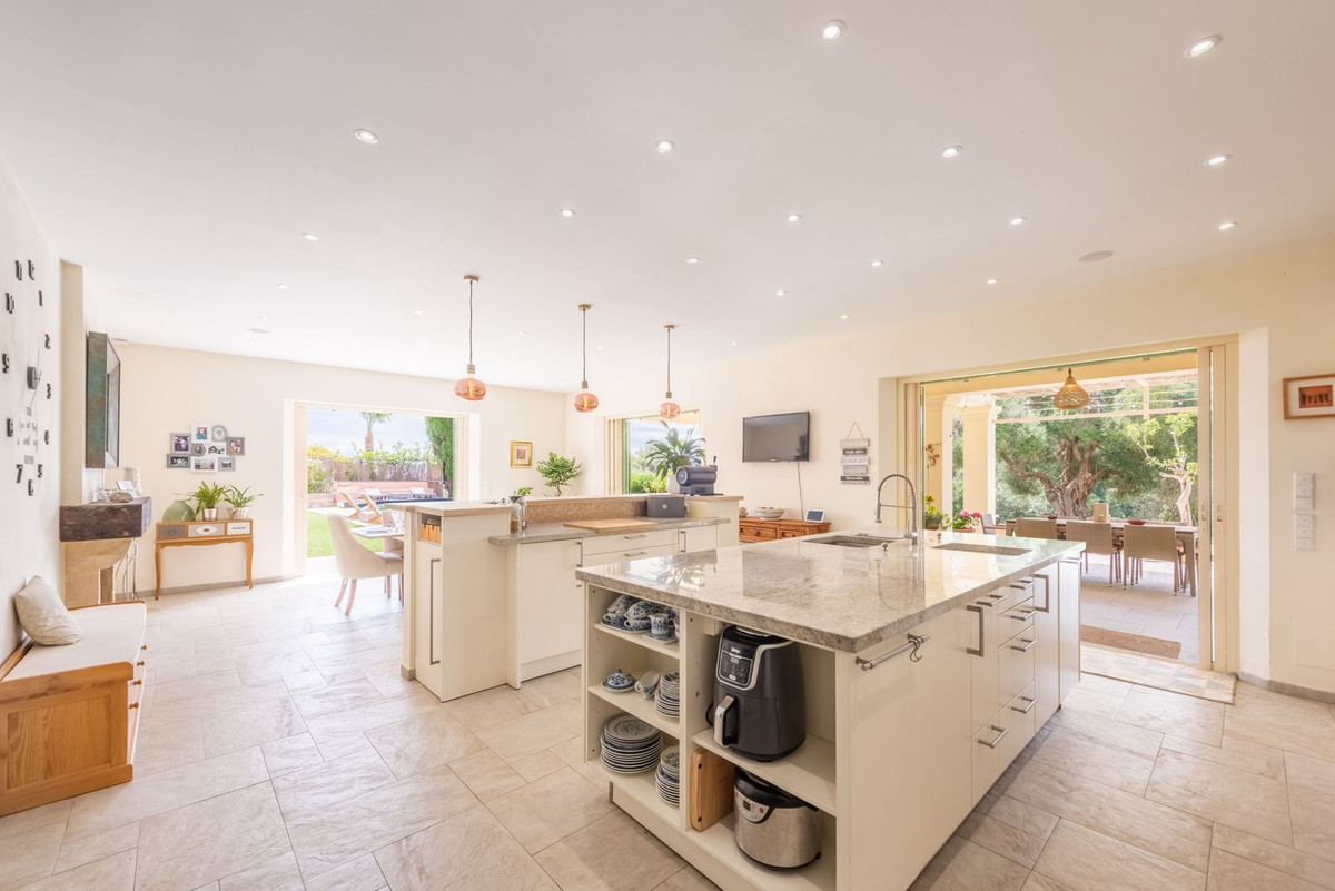 Úgy tervezték, hogy a természetes fény, a villa & apos; s nyílt terv elrendezése létrehoz egy érzés a tér és a szabadság. a konyha könnyedén áramlik a fedett veranda és a szabadtéri étkező, tökéletes szórakoztató vagy élvezheti nyugodt esték alatt a Sotogrande ég.