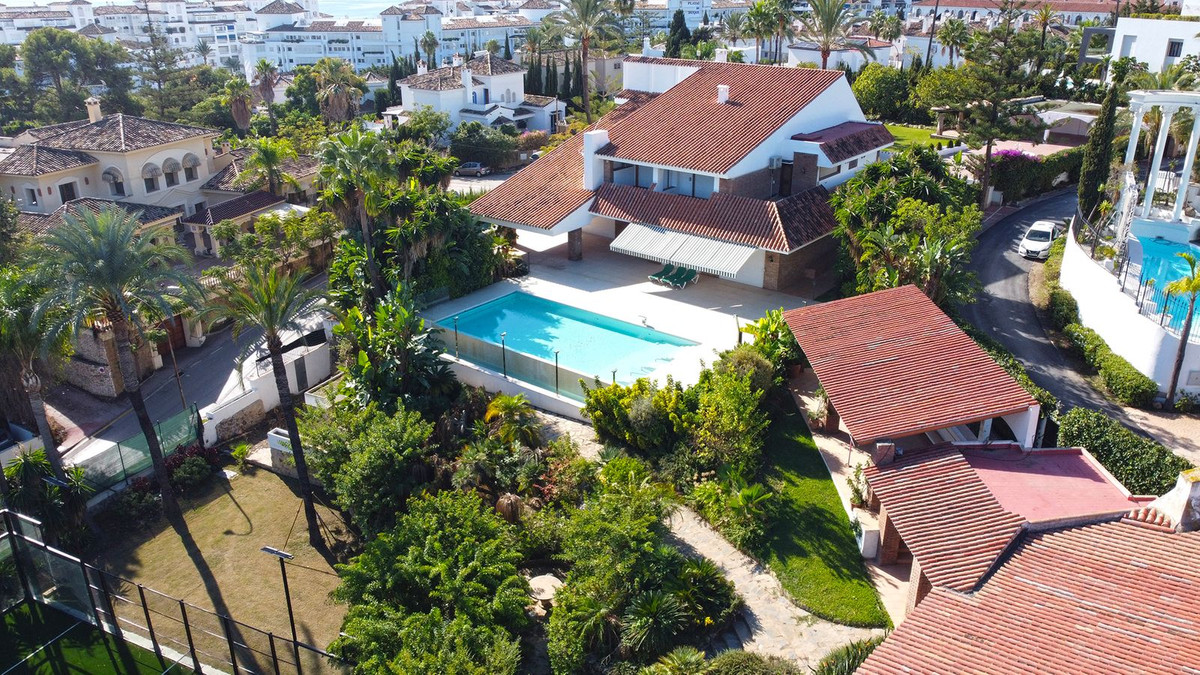 Nagy villa jó állapotban, a teljes beépített terület 834 m ² plusz 573 m ² teraszok és járdák egy telek 4, 348 m ². 1981-Ben épült. Keletre néző. a főépület egy nagy bejárati csarnokból, vendégWC-ből, nagy kétszintes nappaliból, külön étkezőből, konyhából, nappaliból, a teraszra való bejutással, egy külön fürdőszobás hálószobából áll. a felső emeleten található egy nappali, egy második hálószoba, erkéllyel és ensuite fürdőszobával, egy harmadik hálószoba, egy fürdőszobával, egy negyedik hálószoba, egy terasszal, csodálatos kilátással a La Concha és a tenger, és egy nagy főlakosztály, amely egy hálószoba, öltöző, nagy fürdőszoba és terasz kilátással. Nagy parkoló és garázs 5 jármű számára. Más épületek állnak garázs egy jármű, hálószoba fürdőszoba a vezető, hálószoba fürdőszoba a személyzet, és egy mosókonyha. Nagy grill terület egy nagy fedett terasz. Végtelen medence. Evezz teniszpályát. Gyönyörű kertek sok fával.