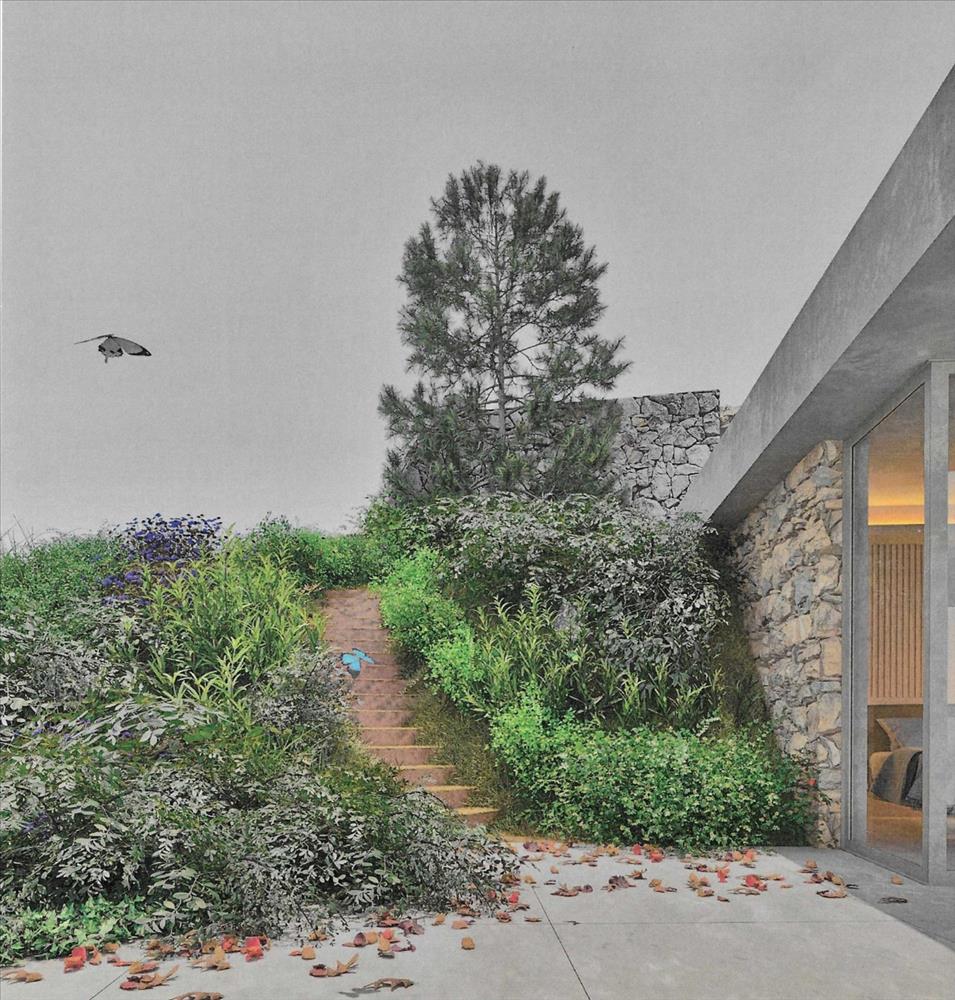 A belső terek nagy csúszós üvegpaneleken keresztül, a táj számára flexibilis módon nyílnak meg, zökkenőmentes beltéri-kültéri életet teremtve. a design hangsúlyozza a magánélet, fény, textúra és integráció a lejtős telek.