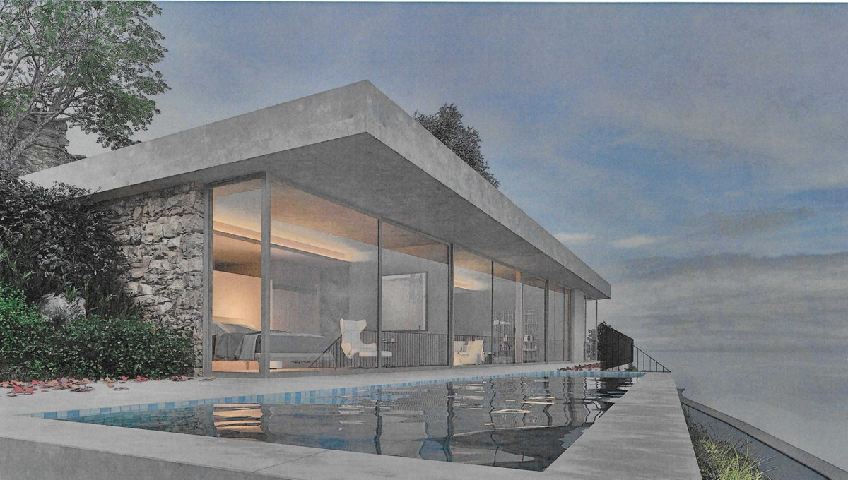 Az ingatlan hosszú, alacsony betontérfogattal rendelkezik, amely a terep fölé emelkedik, nagyvonalú padló- és mennyezeti üvegezés, a tengeri horizonthoz igazodó végtelen úszómedence, több szabadtéri terasz és egy gondosan összeállított mediterrán kert olajfákkal, ciprusokkal, levendulamezőkkel és aromás növényekkel.