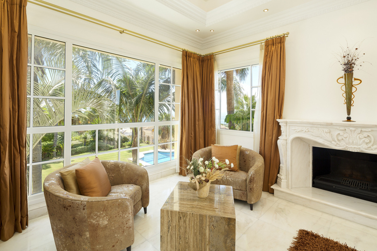 • nagy fűtött medence egy gyönyörű, érett kertben, amely a legmagasabb színvonalú belső dekoráció, beleértve az olasz selyem függönyöket a kiváló minőségű bútorok és bútorok