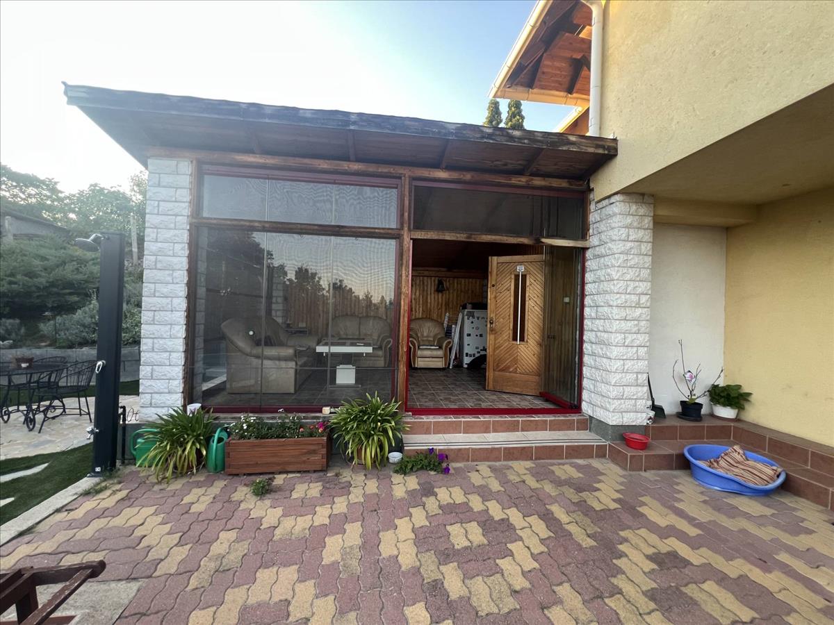 Közvetlenül a ház mellett található egy 30 m2-es, zárt, téliesített fedett terasz, mely könnyedén nyitottá tehető. Innen kilépve, pár lépésre található egy 20 m3-es épített medence, automata rendszerrel ellátva. Ennek fűtése napenergiás megoldással kivitelezhető.